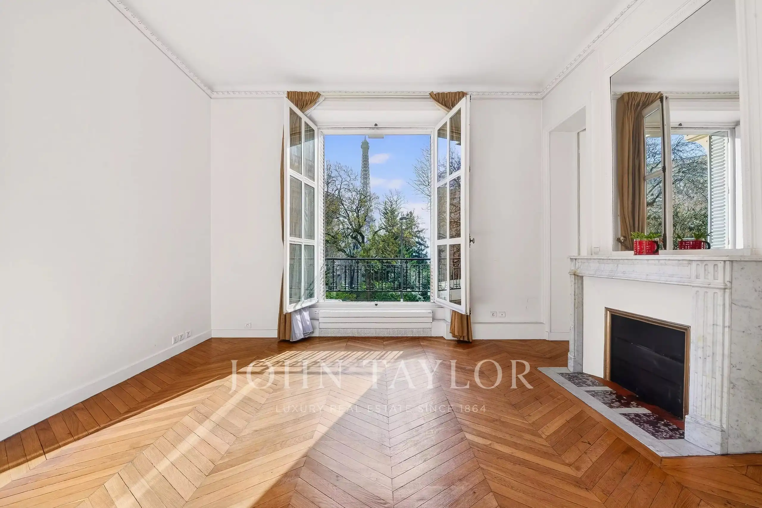A direct, unobstructed Eiffel Tower view. South-facing light all day. Ceilings at 3.20 meters. This is what 237 m² in a 1914 La Muette building looks like when the bones are this good.