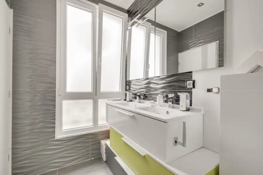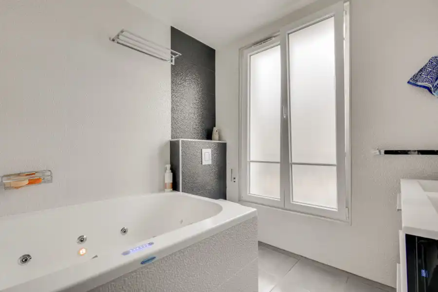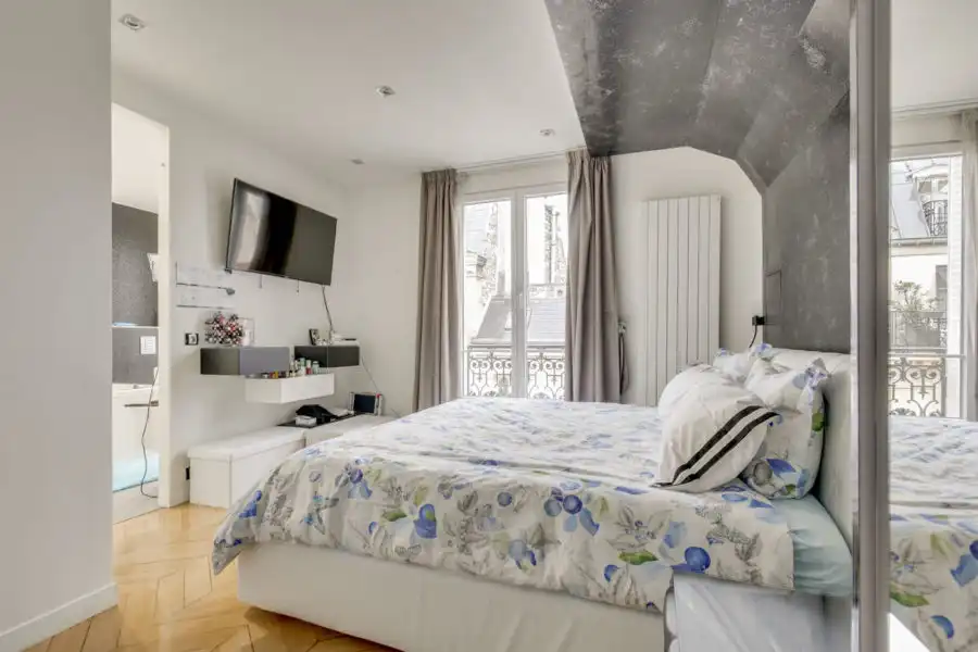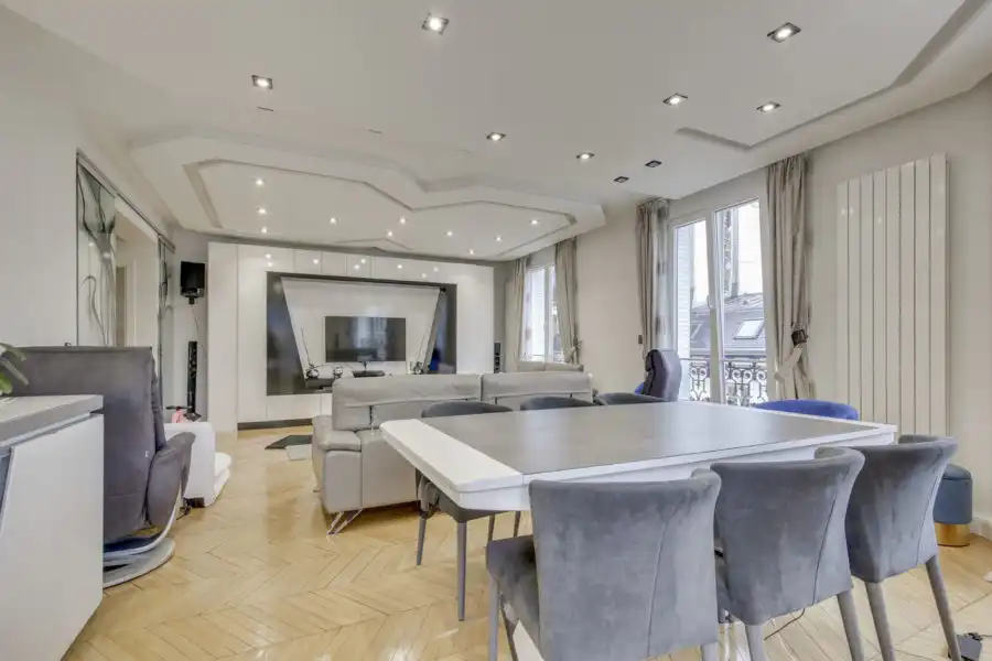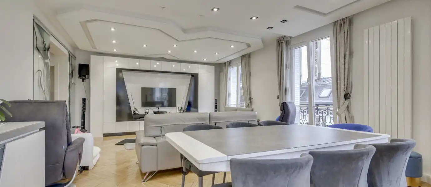Located on the fourth floor of a traditional Haussmannian building with a lift, this apartment property underwent a full renovation just two years ago. The apartment spans 122 sqm and boasts a very modern interior with wood flooring, contemporary ceilings and a tasteful monochrome palette punctuated by playful pops of lime in the bathrooms. The property feature three bedrooms, three bathrooms, a kitchen and a spacious living and dining area with open views over the courtyard.