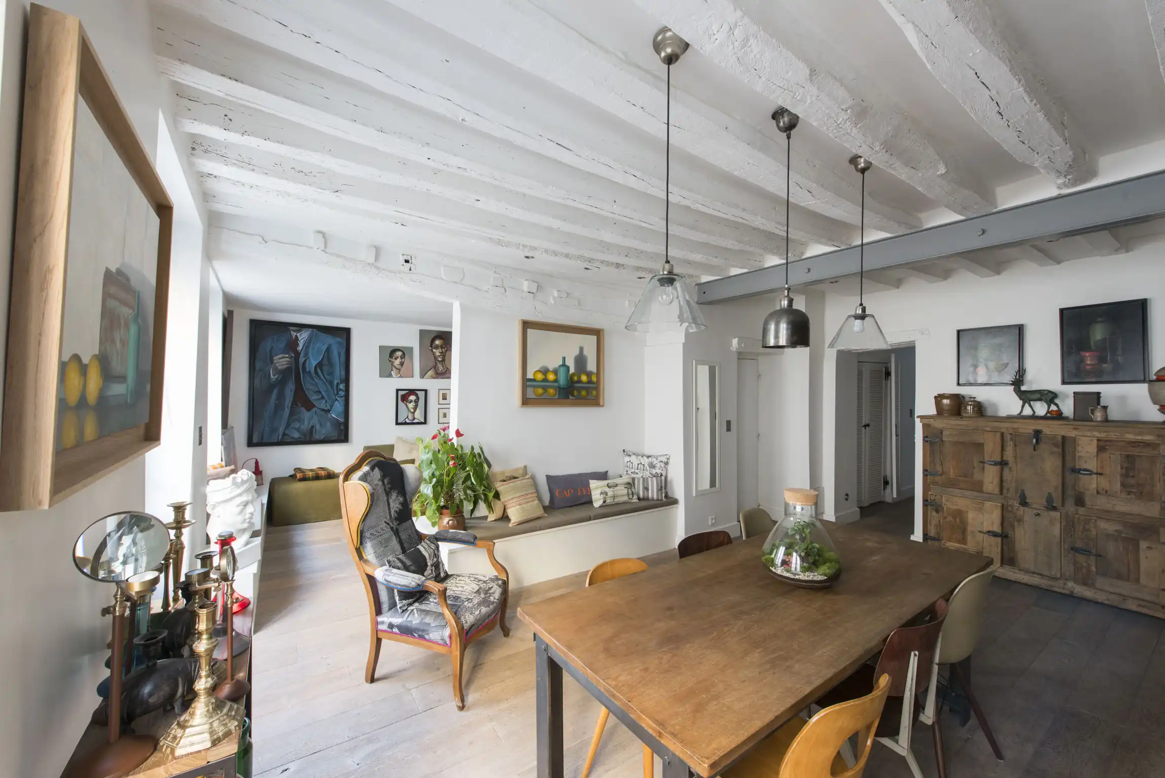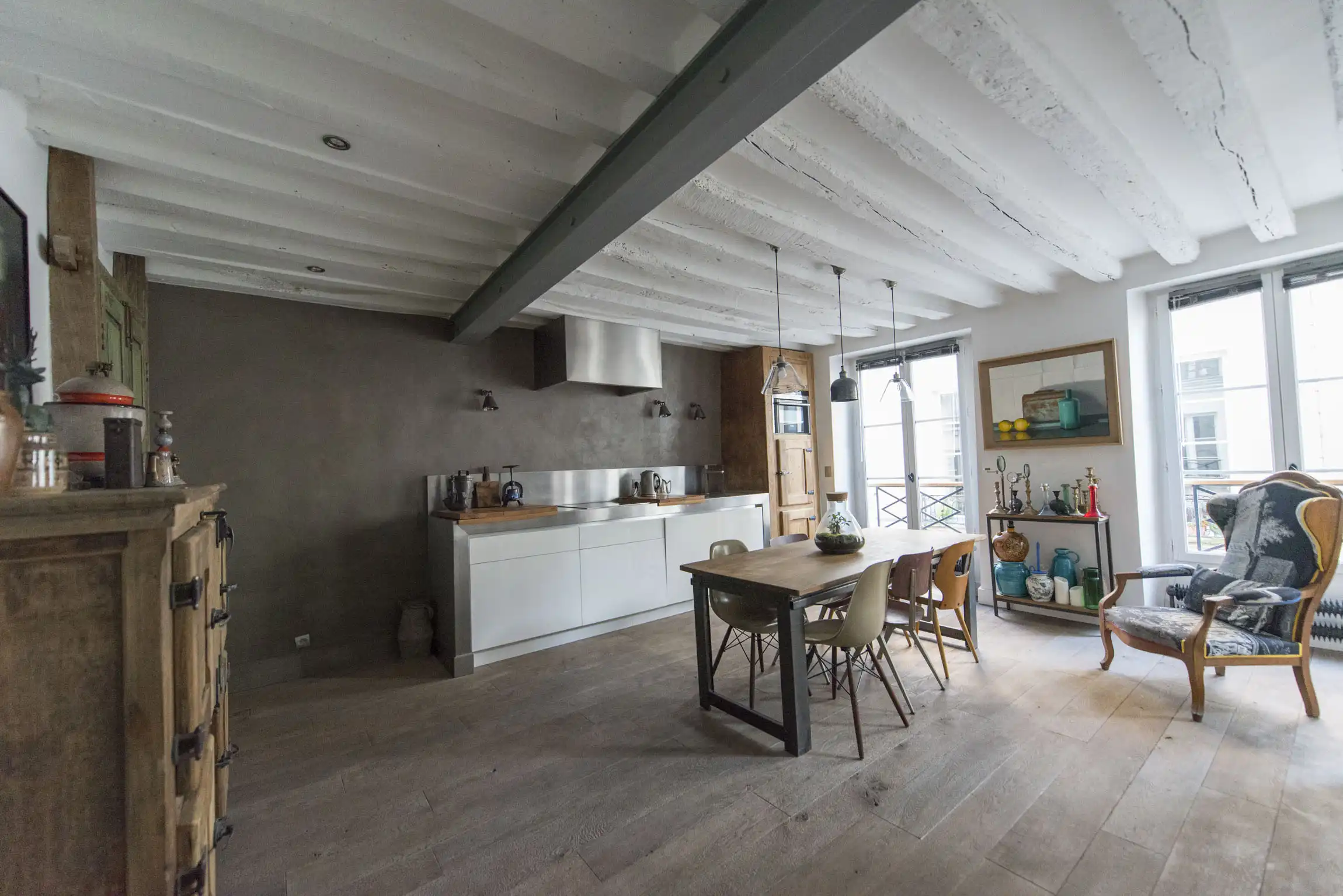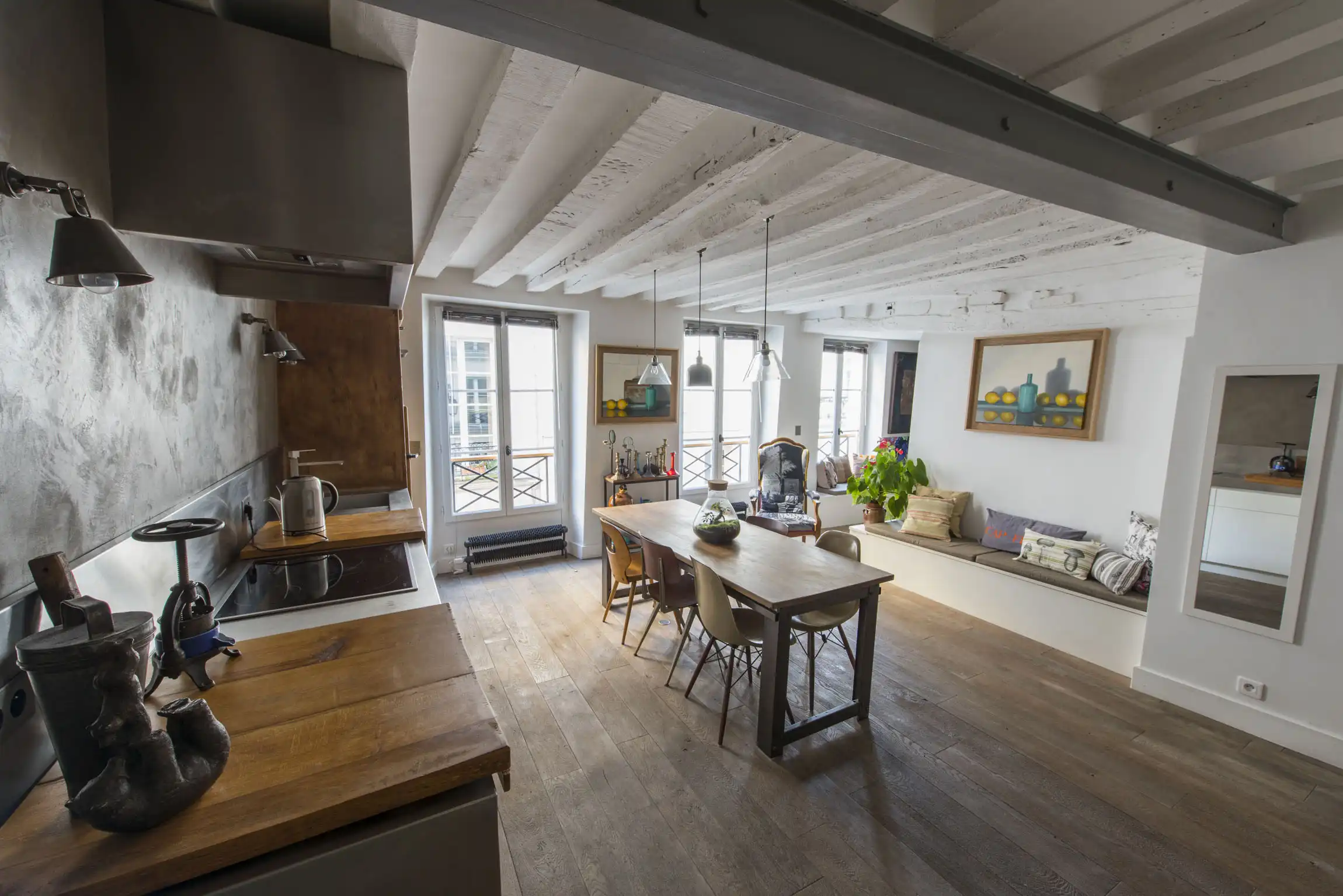 This beautiful two-bed, one-bath, fully renovated 57.31m2 property on the second floor over looks both a quiet street and courtyard in the heart of the Marais.  Original beams have been whitewashed to reflect light and make the space bright and welcoming, while retaining historic charm.  An expansive living space integrates living and dining with an open kitchen concept perfect for today's lifestyles.