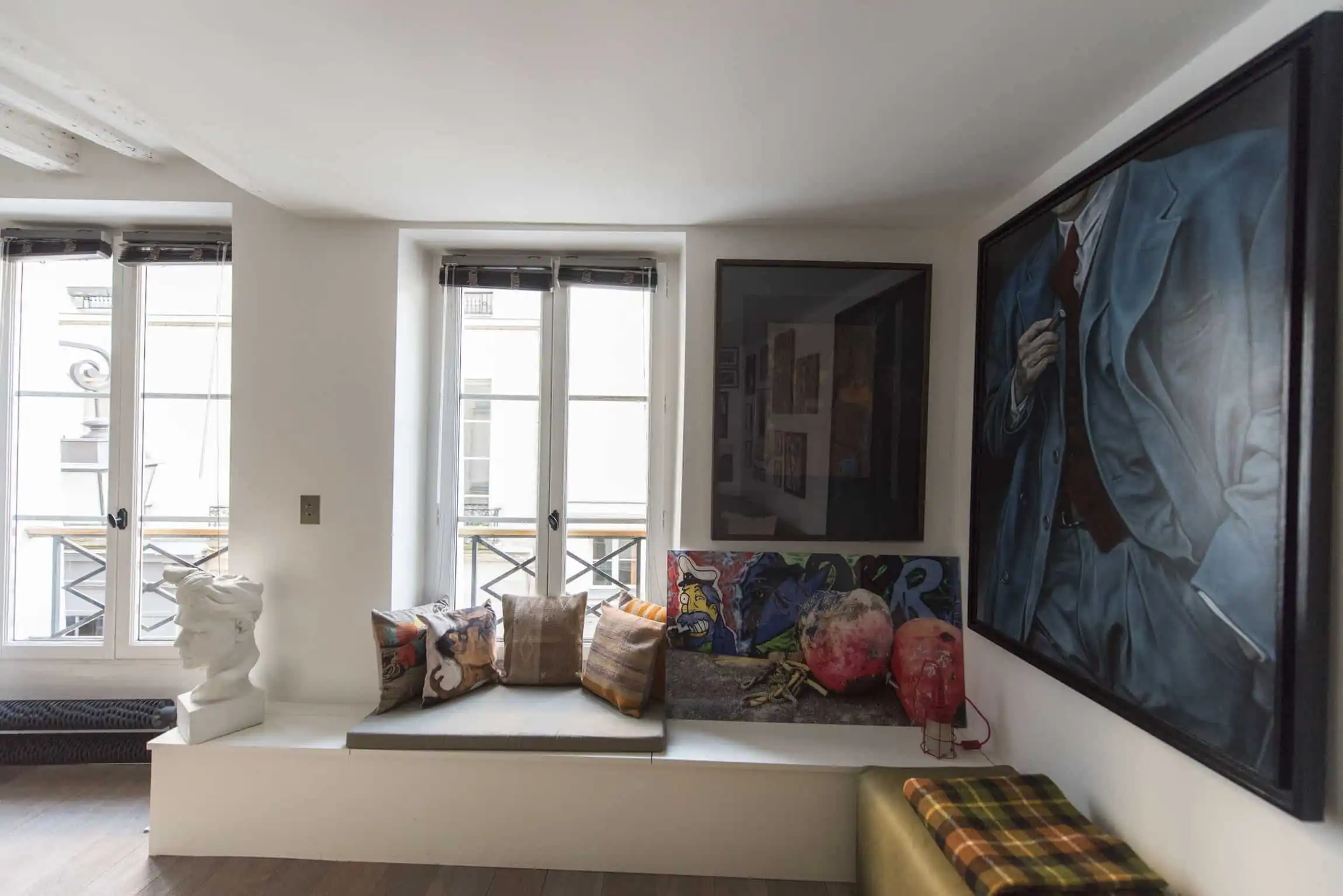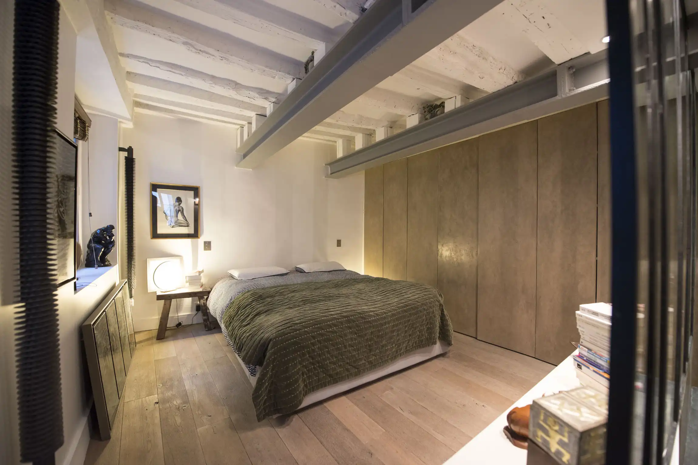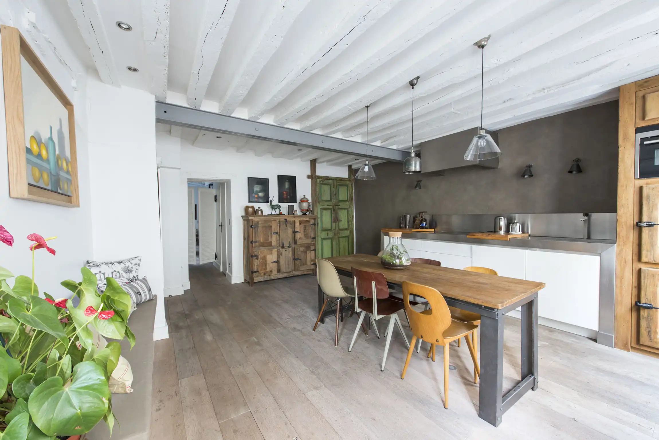 This beautiful two-bed, one-bath, fully renovated 57.31m2 property on the second floor over looks both a quiet street and courtyard in the heart of the Marais.  Original beams have been whitewashed to reflect light and make the space bright and welcoming, while retaining historic charm.  An expansive living space integrates living and dining with an open kitchen concept perfect for today's lifestyles.