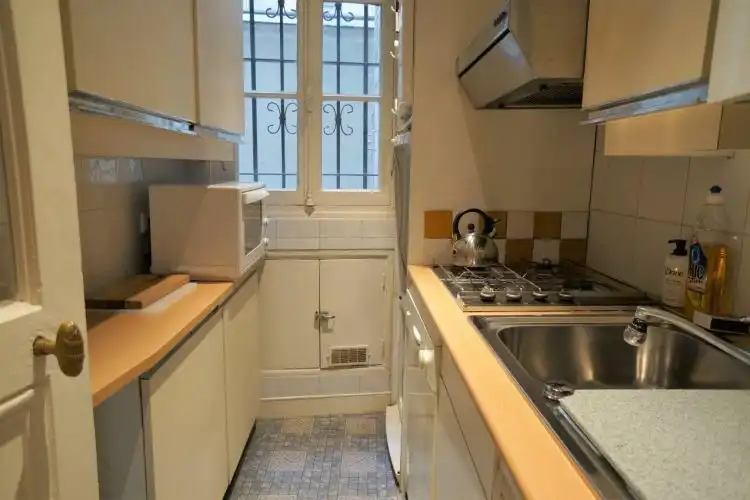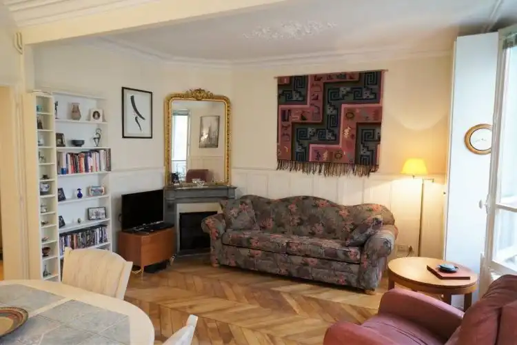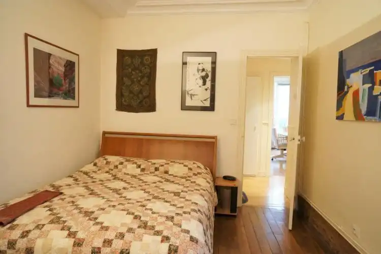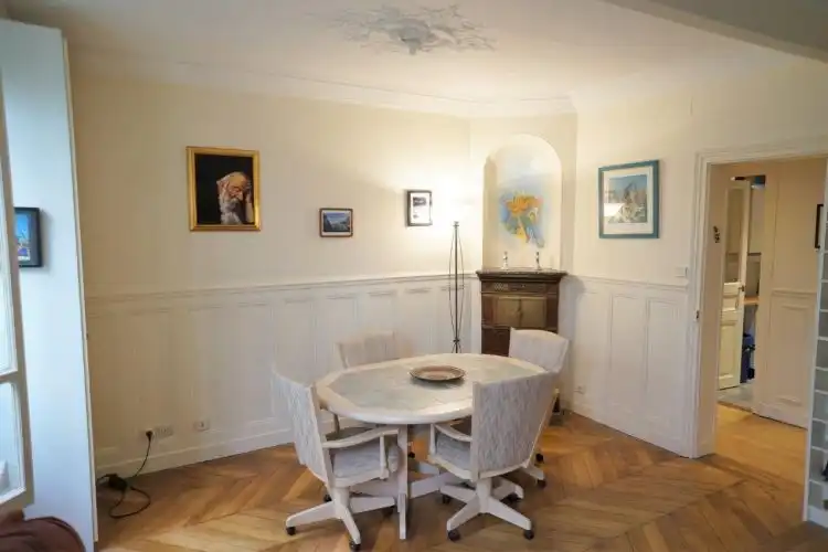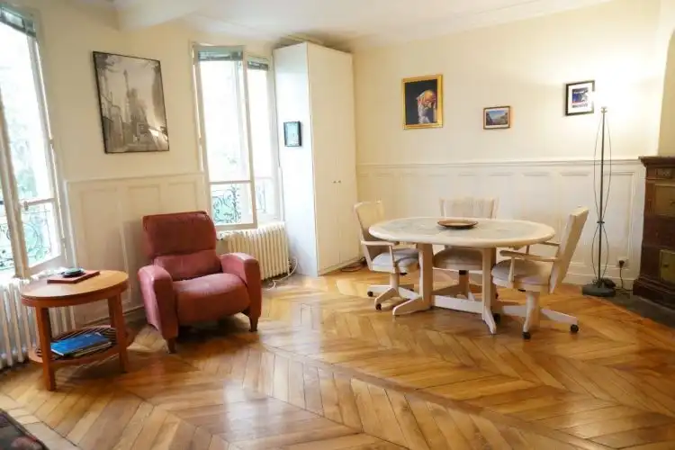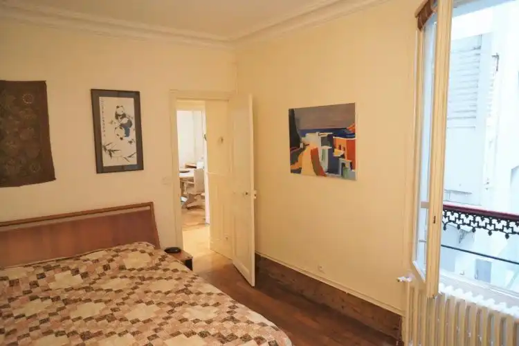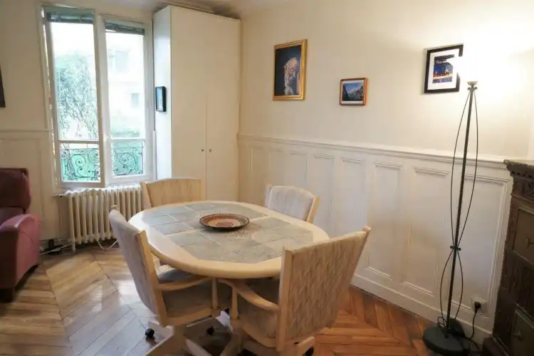 The apartment features a Prussian stove, marble fireplace, moldings, and herring bones wooden floor characteristic of classic Parisian style.   As currently configured, the living / dining room with two large windows provide a gracious feeling. The apartment could also be reconfigured to restore its original plan with 2 bedrooms and 1 living room for a small family. The star-shaped layout is ideal: the entrance leads to the toilet, the kitchen, the bathroom, the double living room and the very quiet bedroom facing on a second small courtyard. The bedroom is large enough to accommodate large closets.