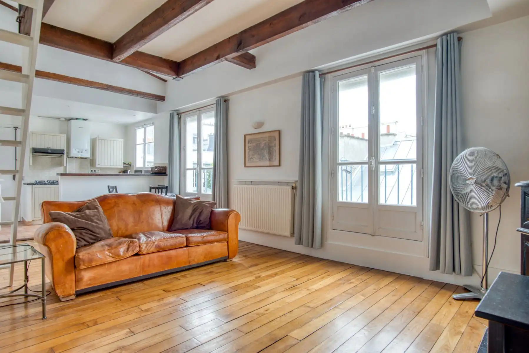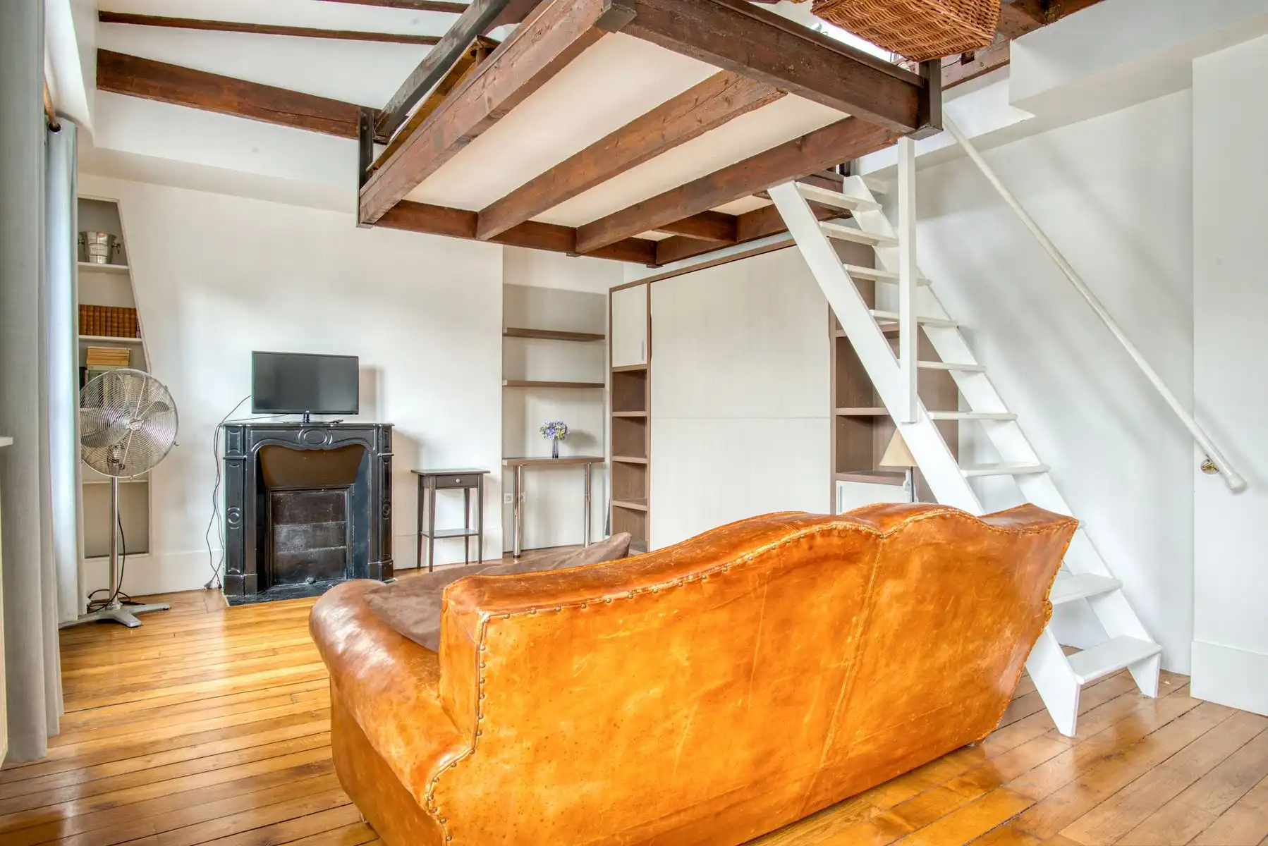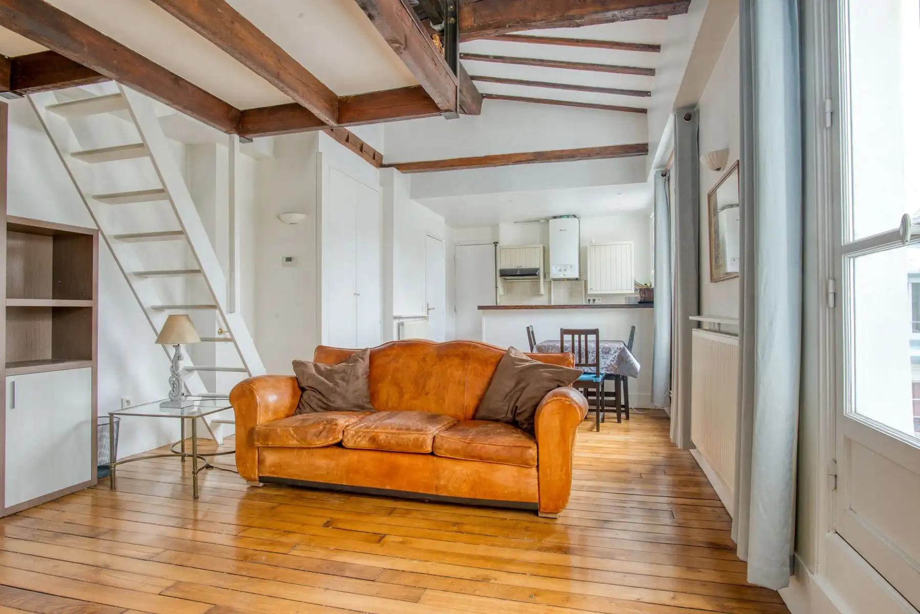 This large sunny apartment of approximately 37 m2 features floor to ceiling windows with the possibility of pushing the balconets out and creating a terrace, as some neighbors have already done.  Historic beams give charm to the highly functional space, and a sleeping area has been lofted into the raised, beamed ceiling vault above.  The mezzanine is reached by a stairway and features a window in the vaulted ceiling.