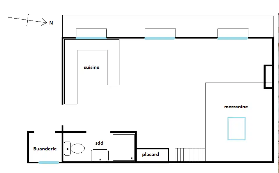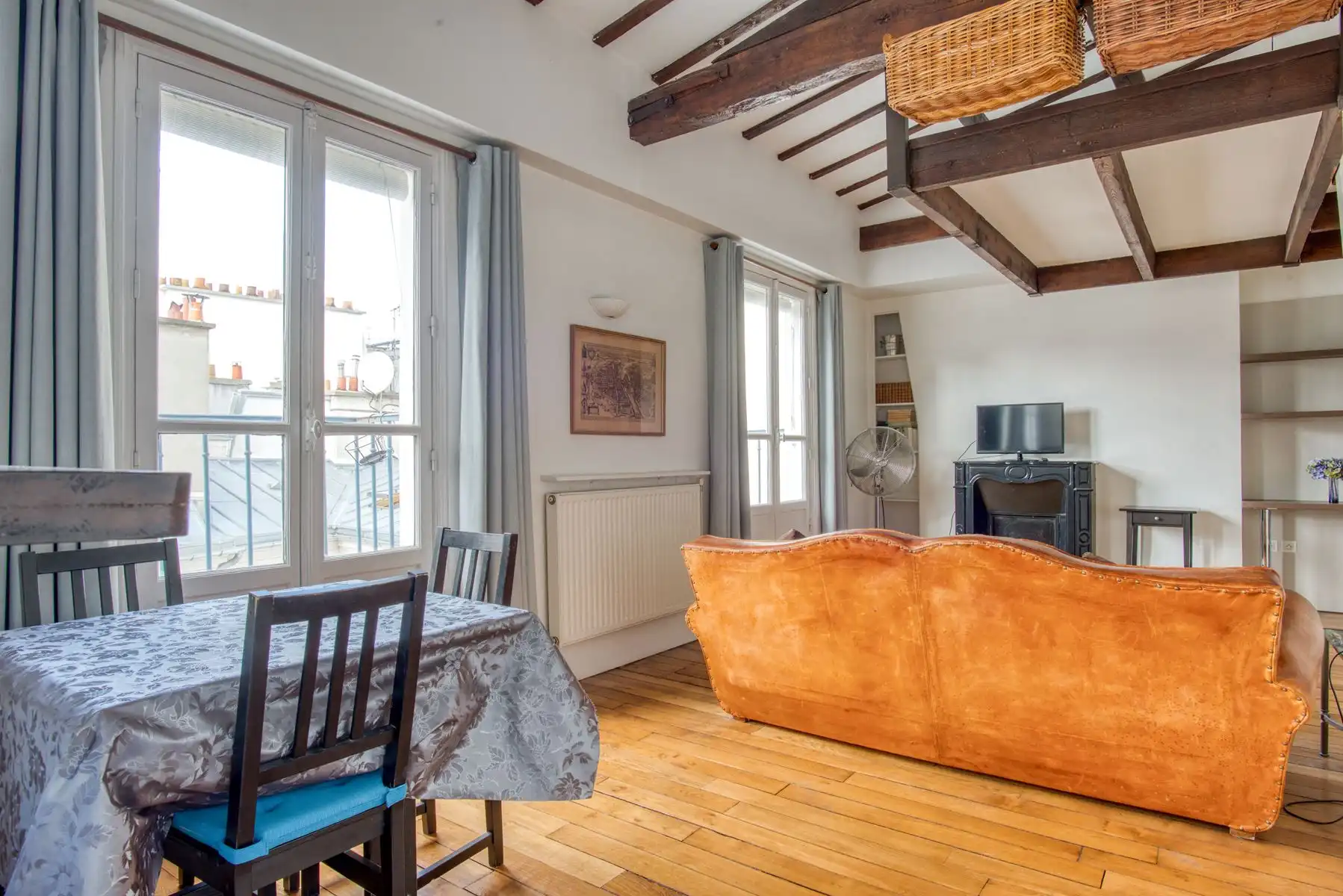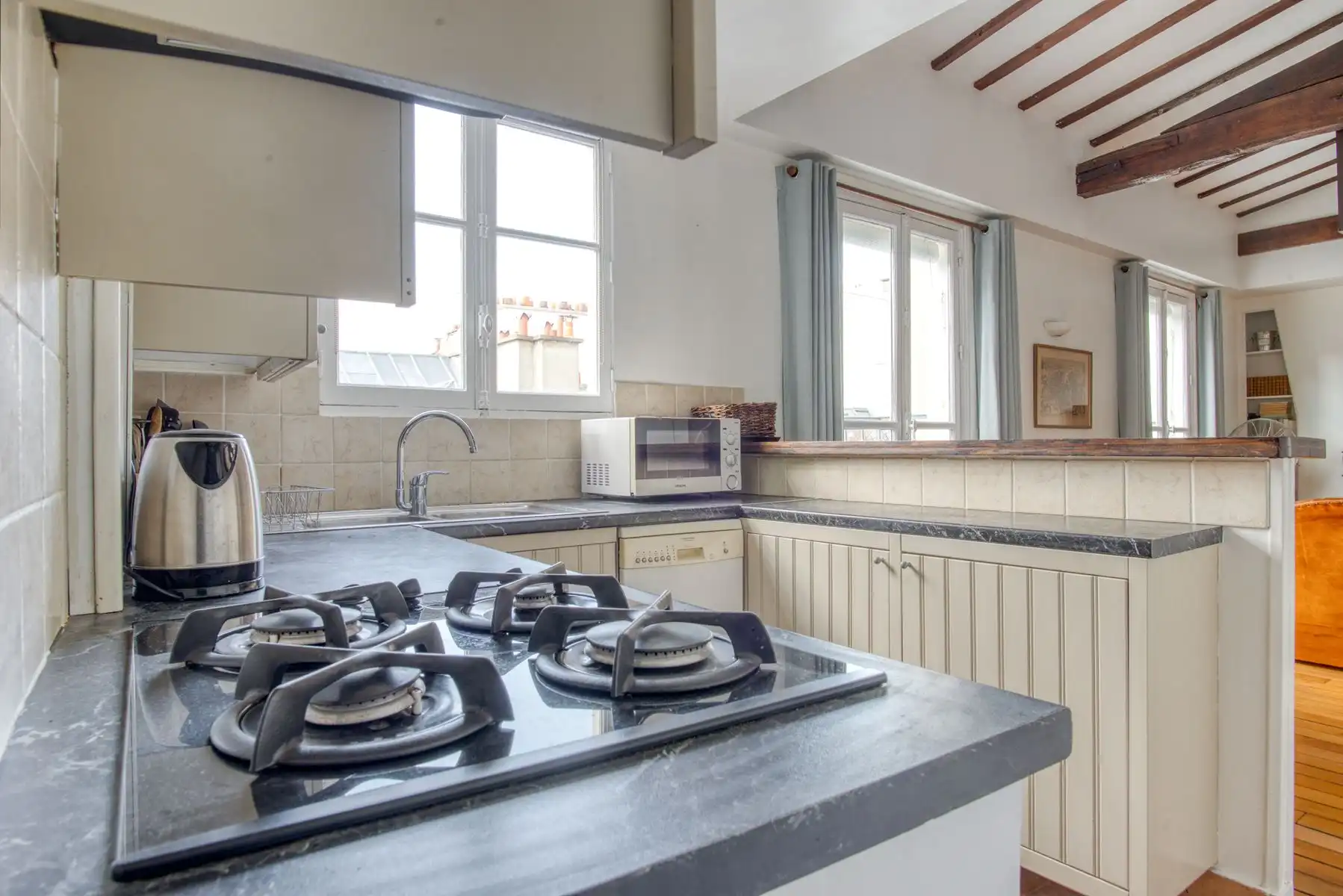 This large sunny apartment of approximately 37 m2 features floor to ceiling windows with the possibility of pushing the balconets out and creating a terrace, as some neighbors have already done.  Historic beams give charm to the highly functional space, and a sleeping area has been lofted into the raised, beamed ceiling vault above.  The mezzanine is reached by a stairway and features a window in the vaulted ceiling.