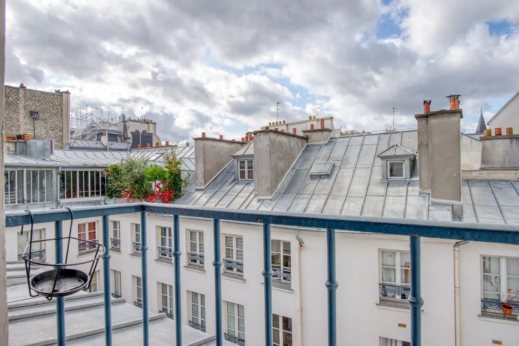 At the center of rue de Seine, rue de Buci and rue Mazarine, in the heart of the sixth arrondissement lies this oasis of calm at the top of a building, hidden away.  An elevator lifts you up to an open view over roof tops where the bustle of the street seems far away, but in reality, is just steps away.