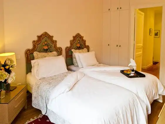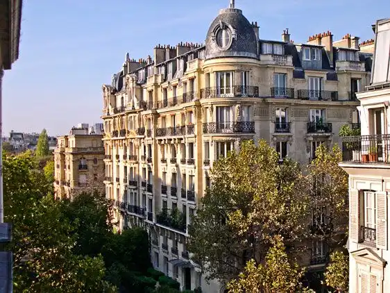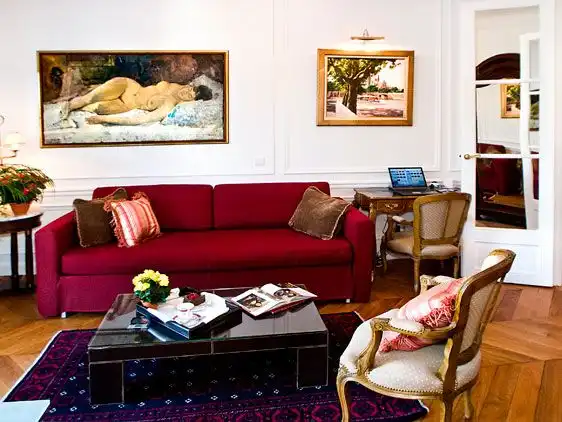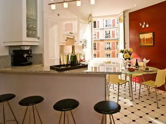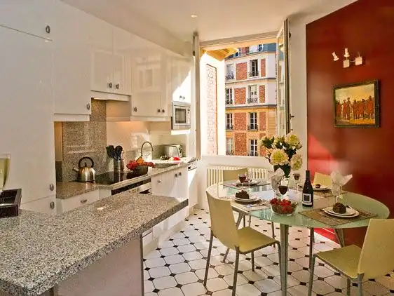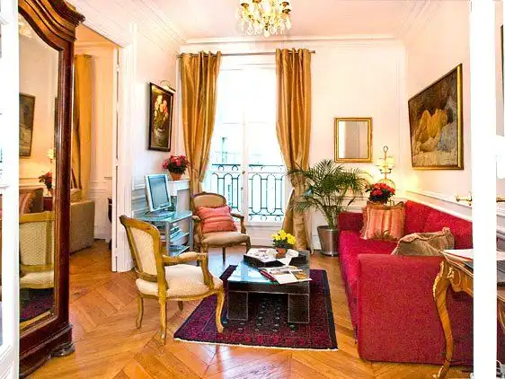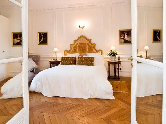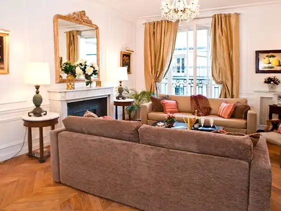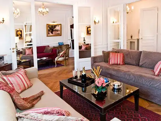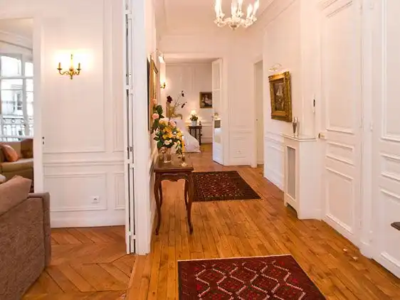 A generous entry opens to the double living / dining room overlooking the Eiffel Tower.