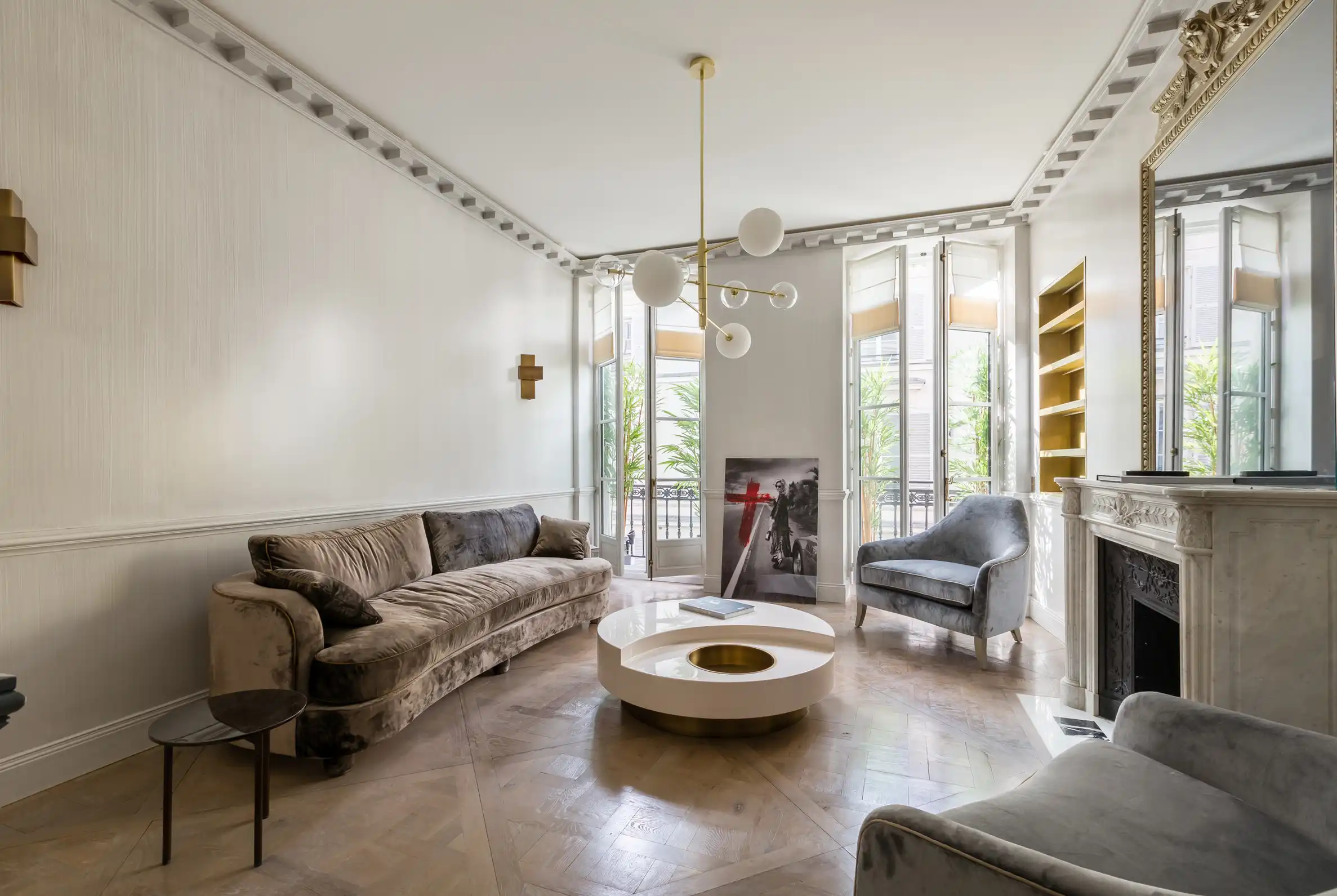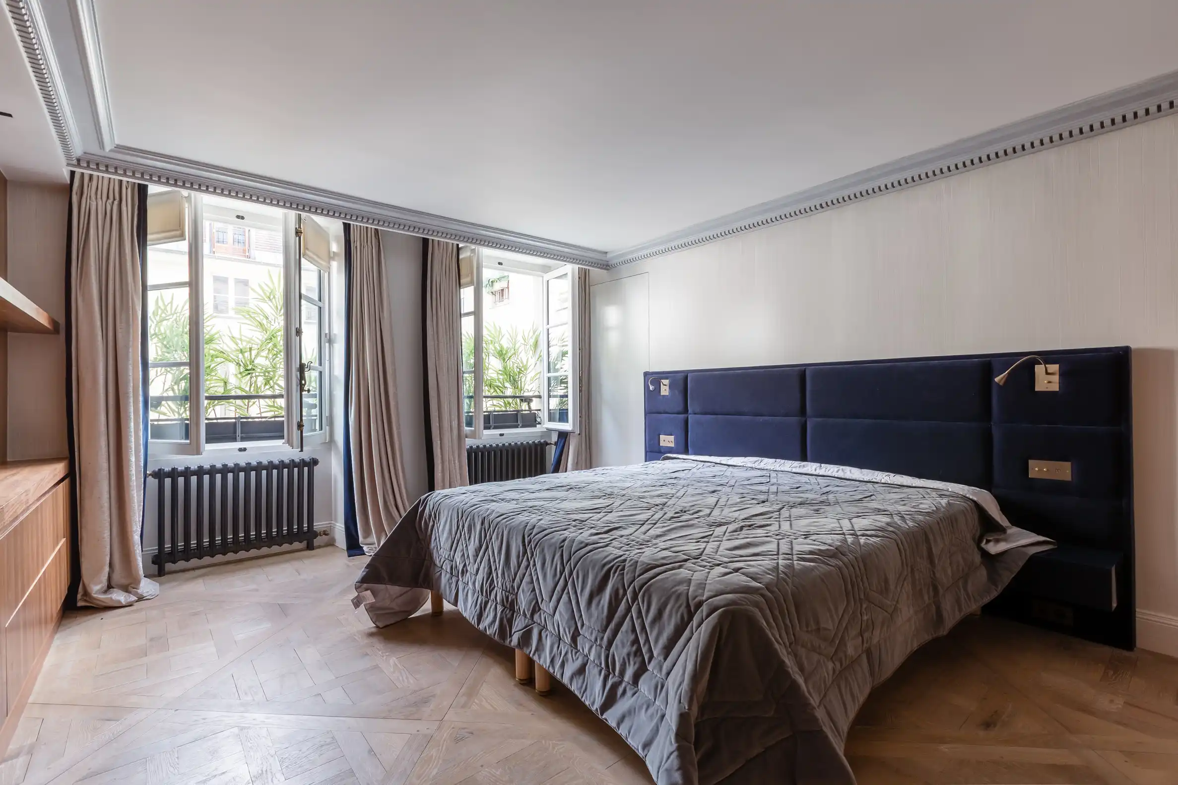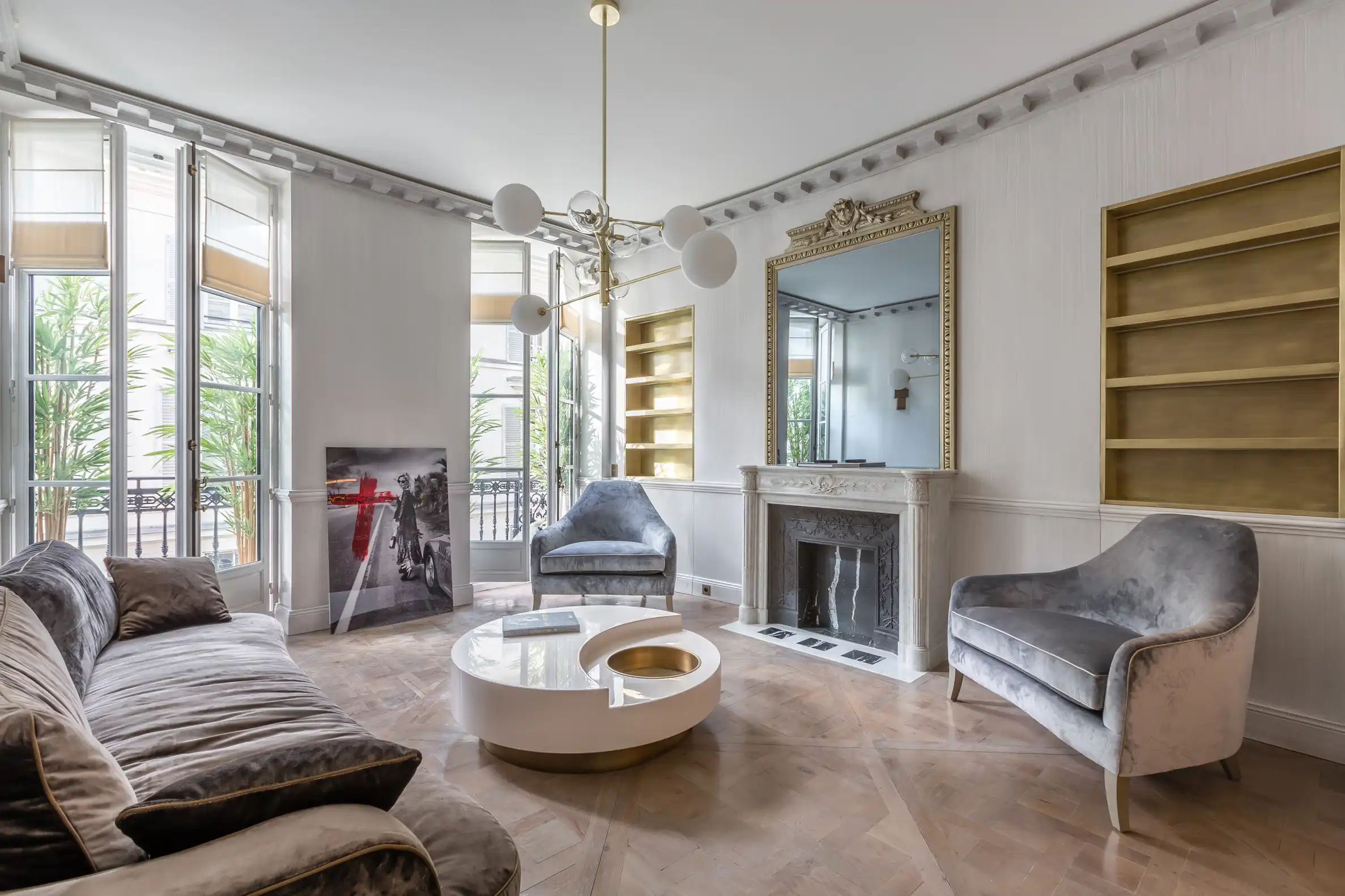 The entire space has been re-imagined, for an updated twist on an elegant and classic Parisian apartment. The moldings, fireplace, and parquet de Versailles flooring remains, but the historic wood floors have been refinished - looking equally at home in this century or the last. Additionally, a rare and custom air conditioning system, one of only 100 of this type in the world, has been added to ensure that climate controls in the residence are invisible, silent and of the highest caliber.