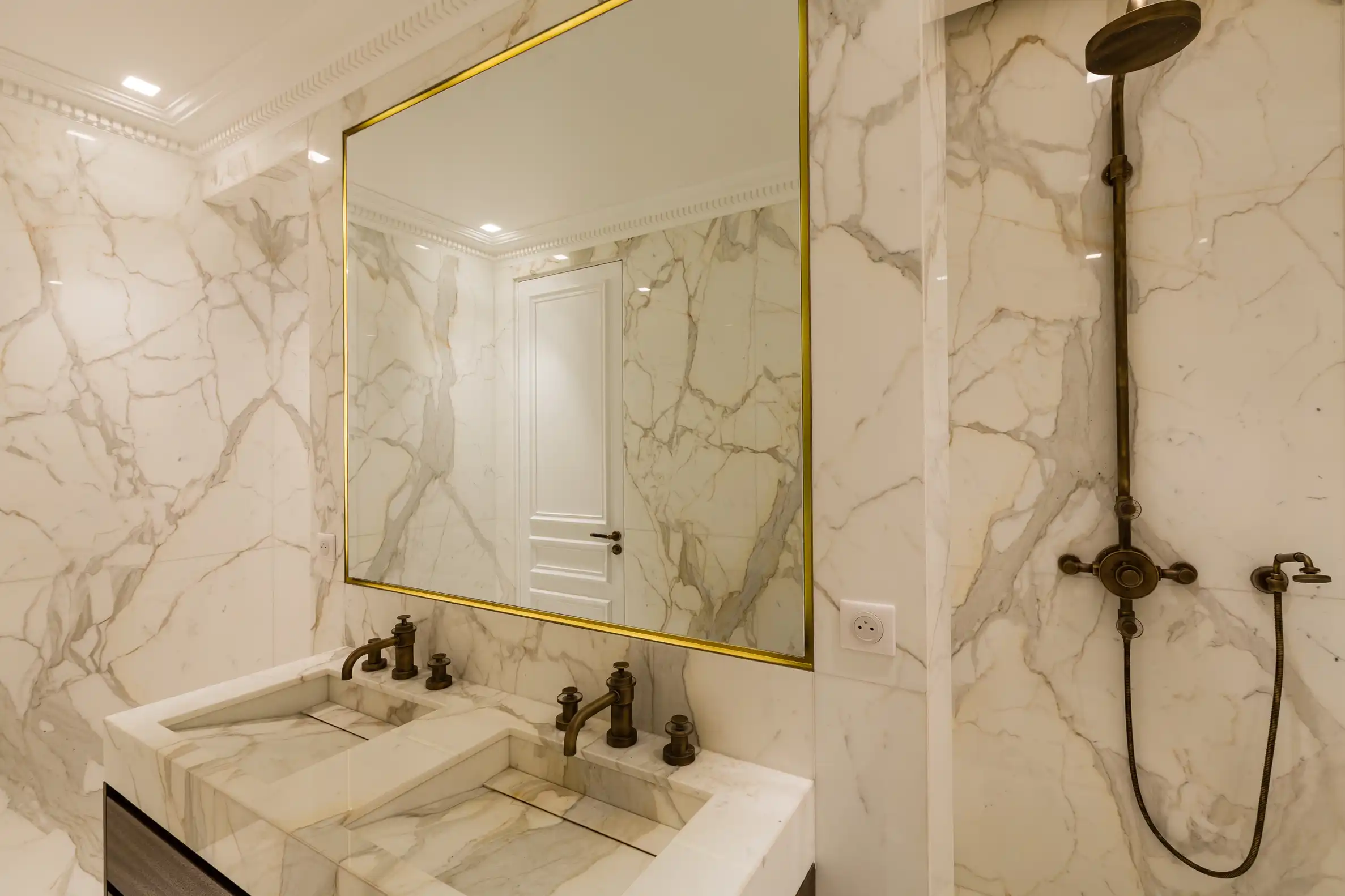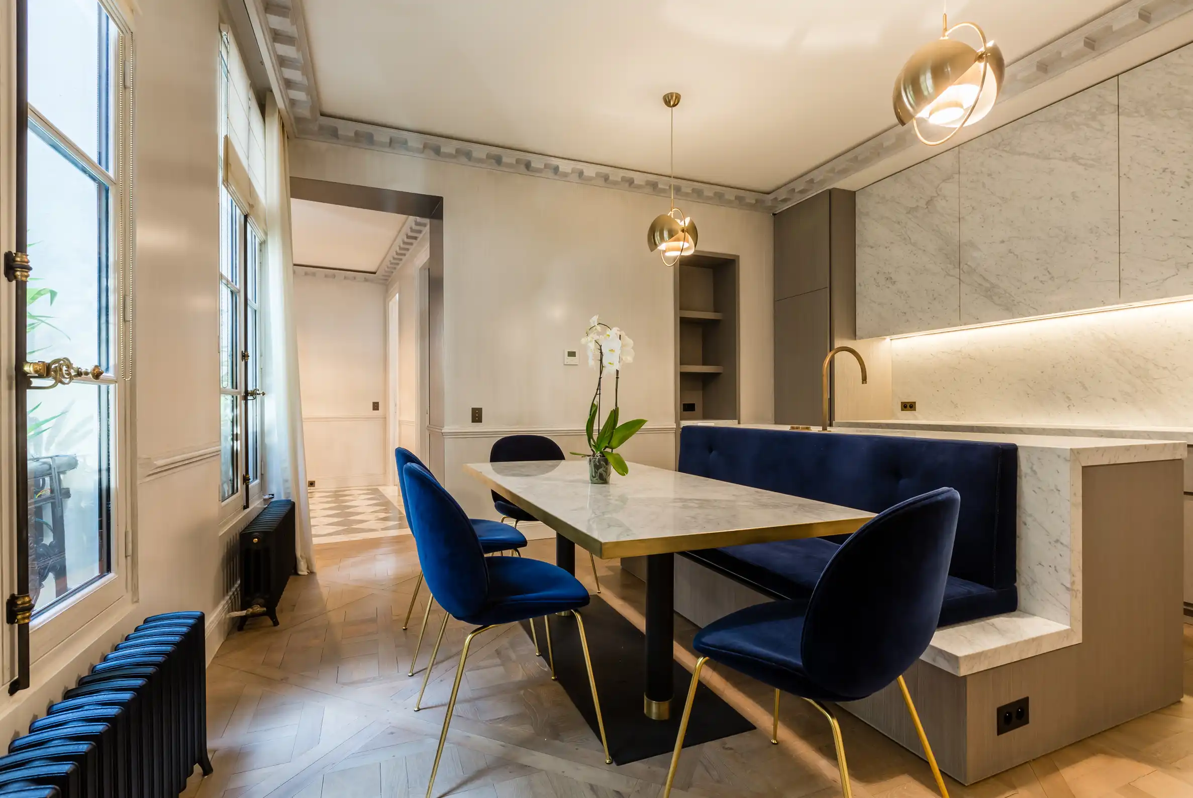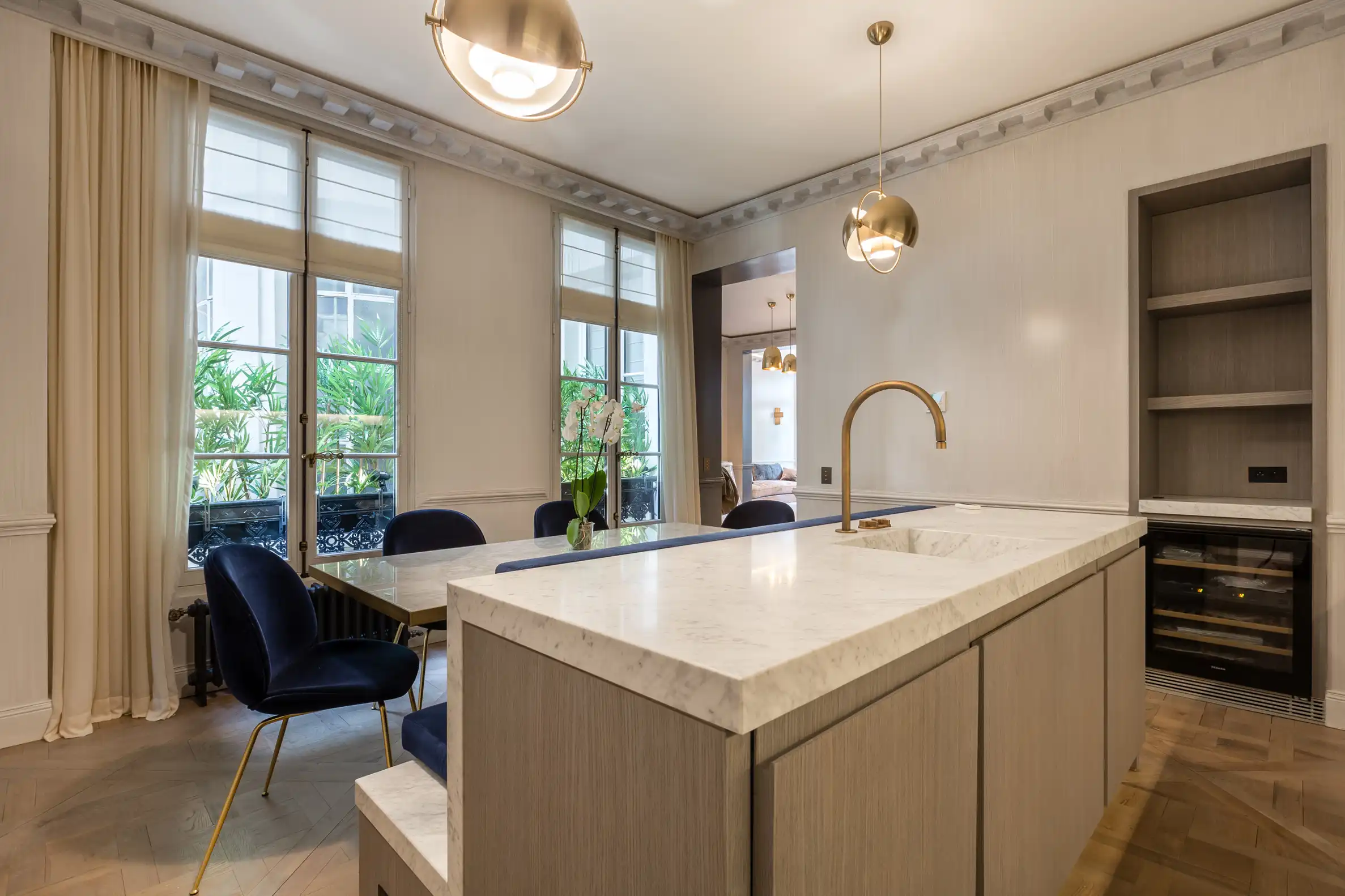 The entire space has been re-imagined, for an updated twist on an elegant and classic Parisian apartment. The moldings, fireplace, and parquet de Versailles flooring remains, but the historic wood floors have been refinished - looking equally at home in this century or the last. Additionally, a rare and custom air conditioning system, one of only 100 of this type in the world, has been added to ensure that climate controls in the residence are invisible, silent and of the highest caliber.