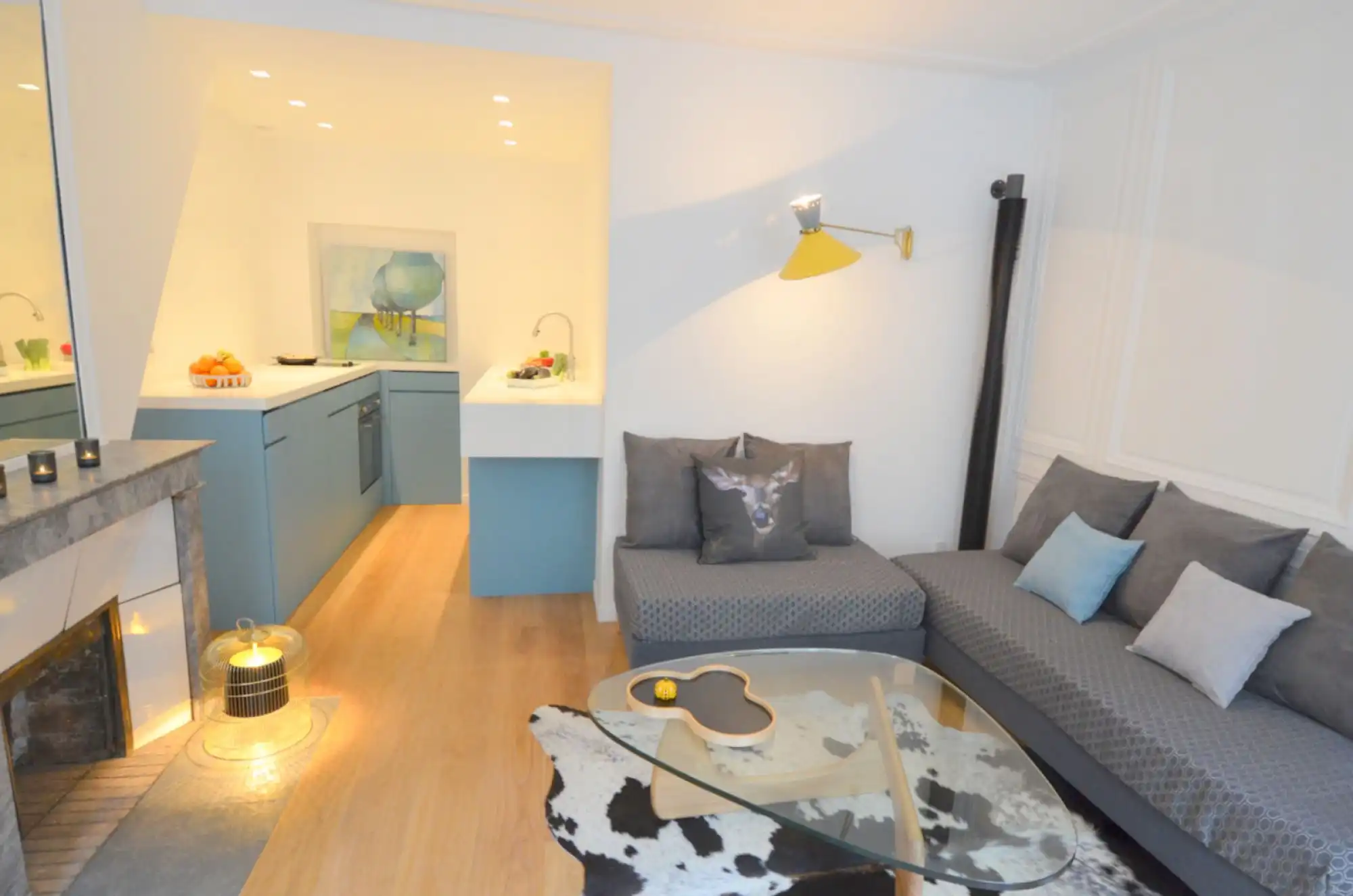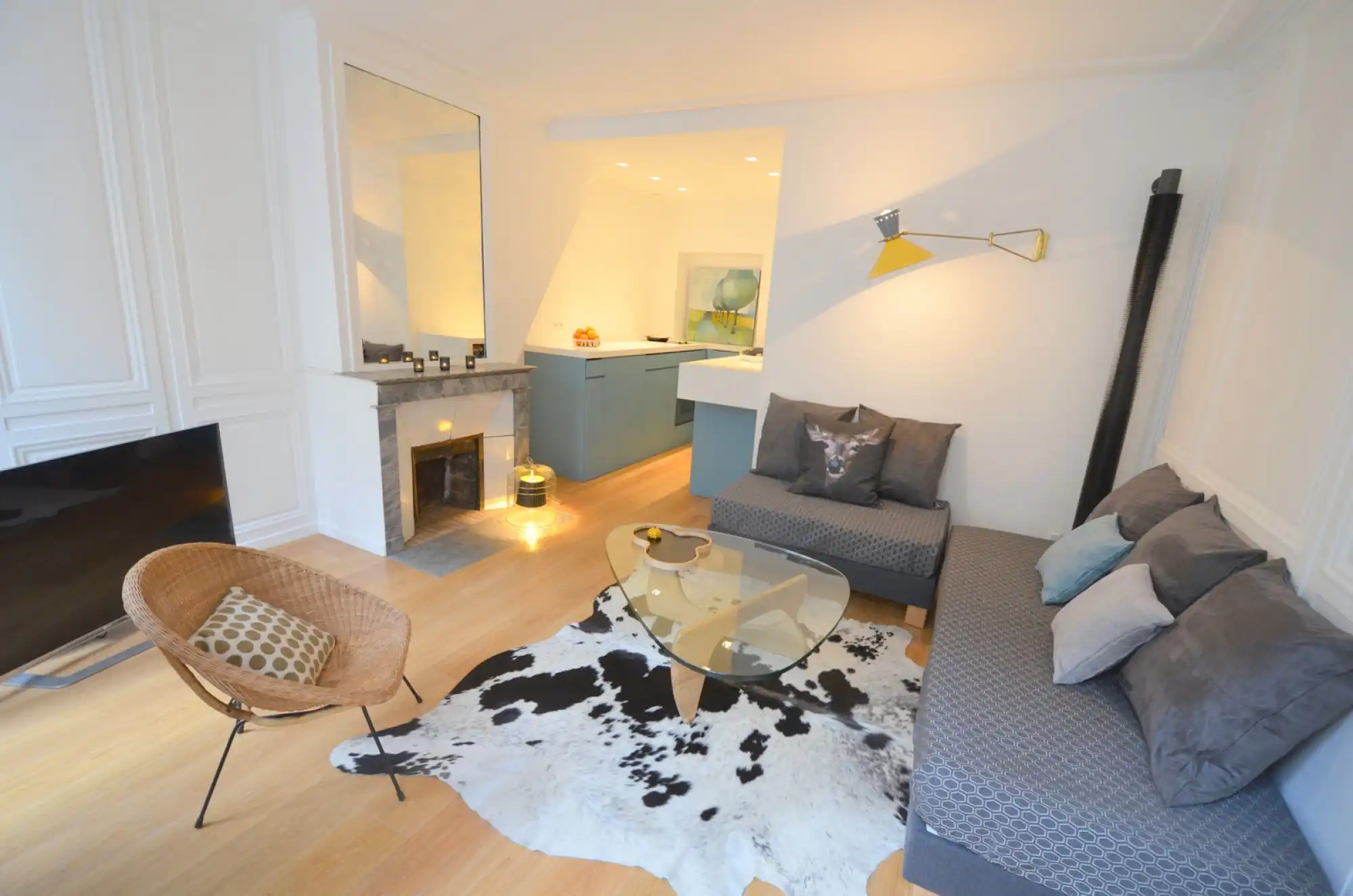 Located on rue de Turenne in the Haute Marais area of Paris, this beautiful 44.5 m2 apartment is located steps from all the historical sites in the center of Paris. The beautifully renovated first floor property (2nd floor American) features a living room / dining room with classic fireplace and stylish open kitchen. The blending of modern and classic elements result in a perfectly balanced Paris pied-a-terre.