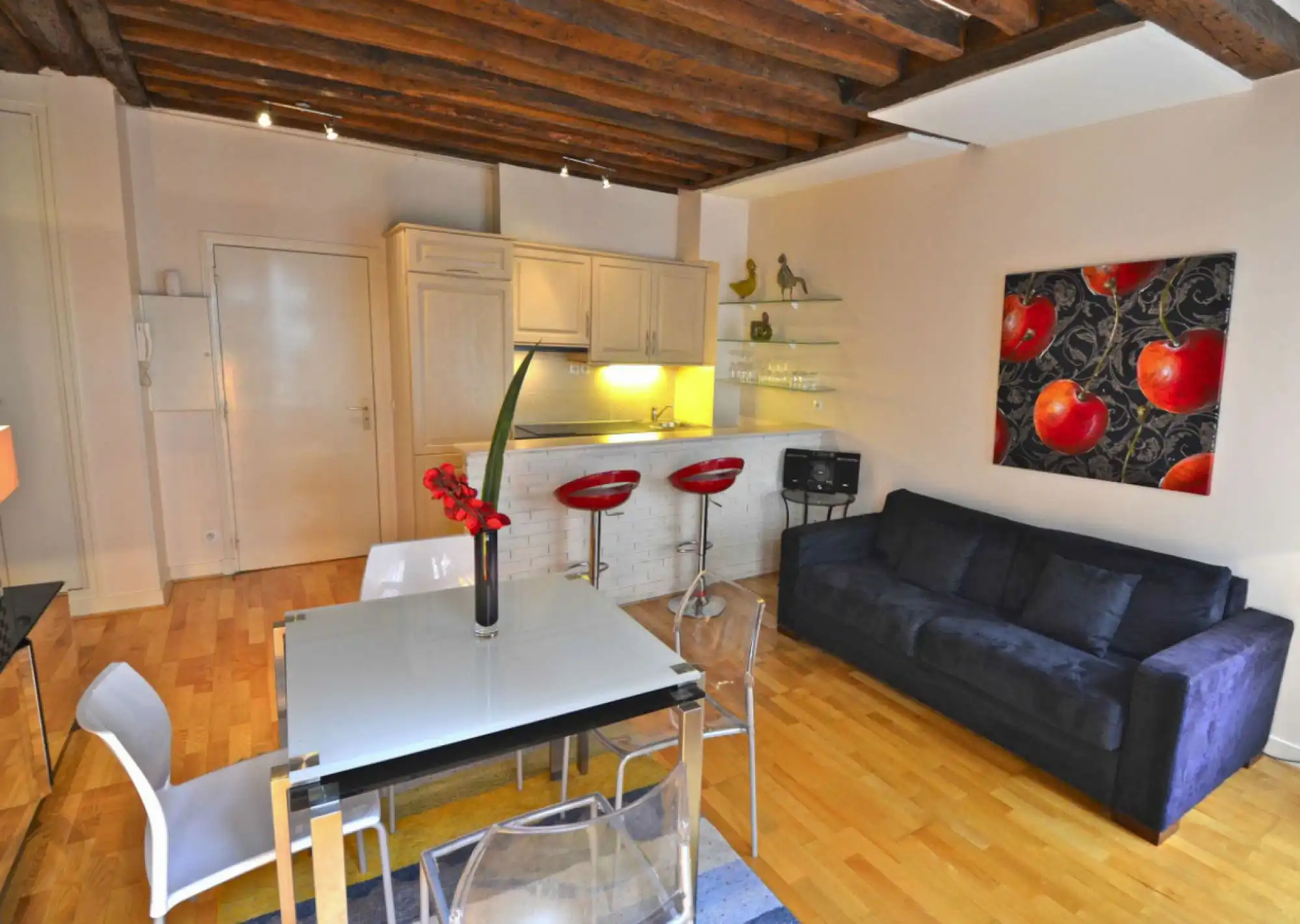 This charming one bedroom apartment is located on rue de Turenne , near rue Bretagne in the heart of the Haute Marais district. The small, well maintained building is located just steps from all the historical sights of central Paris.   The 39 m2 first floor apartment (2nd floor American) is accessed by an elevator or stairs, and includes a living room with dining area and an open kitchen. The windows overlook the street.