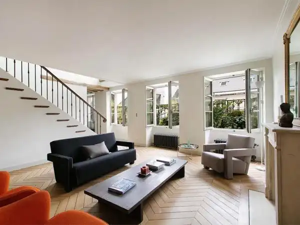 This bright and inviting two-bedroom duplex sits in the roof of an 18th century building on rue de Varenne. On the downstairs floor, the living room, library, dining room and kitchen share lovely light, and a balcony, which spans the front of the building. A center staircase leads upstairs to a large master bedroom suite, and a second bedroom suite. The top floor has its own charm with its pitched ceiling, beautiful beams and individual balconies in each bedroom.