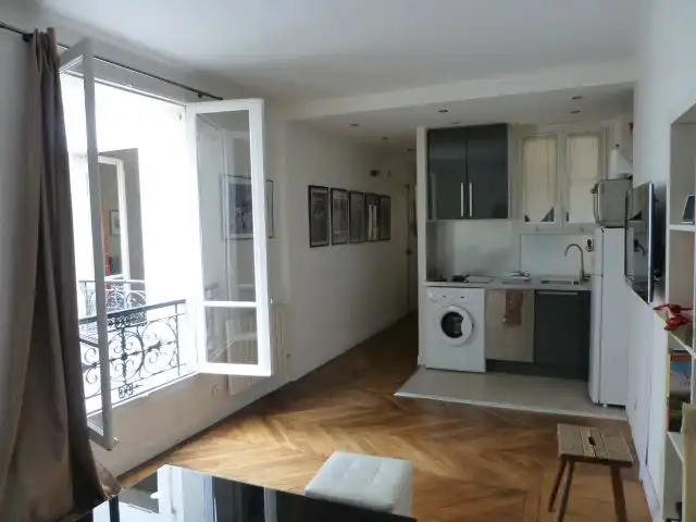The original chevron parquet flooring found throughout the apartment is in excellent condition.  An entry hall leads to a nicely sized living area with open kitchen that, like the bathroom with its shower and WC, has been renovated with high quality materials.   Two large west facing windows in the living area and another in the bedroom provide ample afternoon sunlight and look onto the courtyard but without vis à vis.