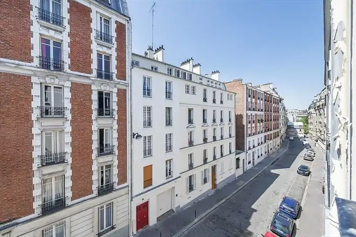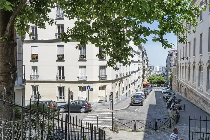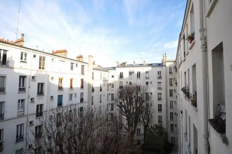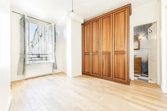 The property is only a few meters away from steps leading to the Sacré Coeur. The light, spacious and well-kept communal areas and stairwell make for a welcoming entry to an apartment that benefits from an excellent floorplan. The entrance houses a separate WC as well as a large closet/laundry space and opens onto a spacious dining/living room and open kitchen.  Two large east facing windows overlook the quiet street and flood the space with sunlight. Wooden parquet and a working marble fireplace add genuine Parisian charm. The bedroom offers views over the treetops in a particularly large courtyard, and a nicely sized en-suite bathroom.