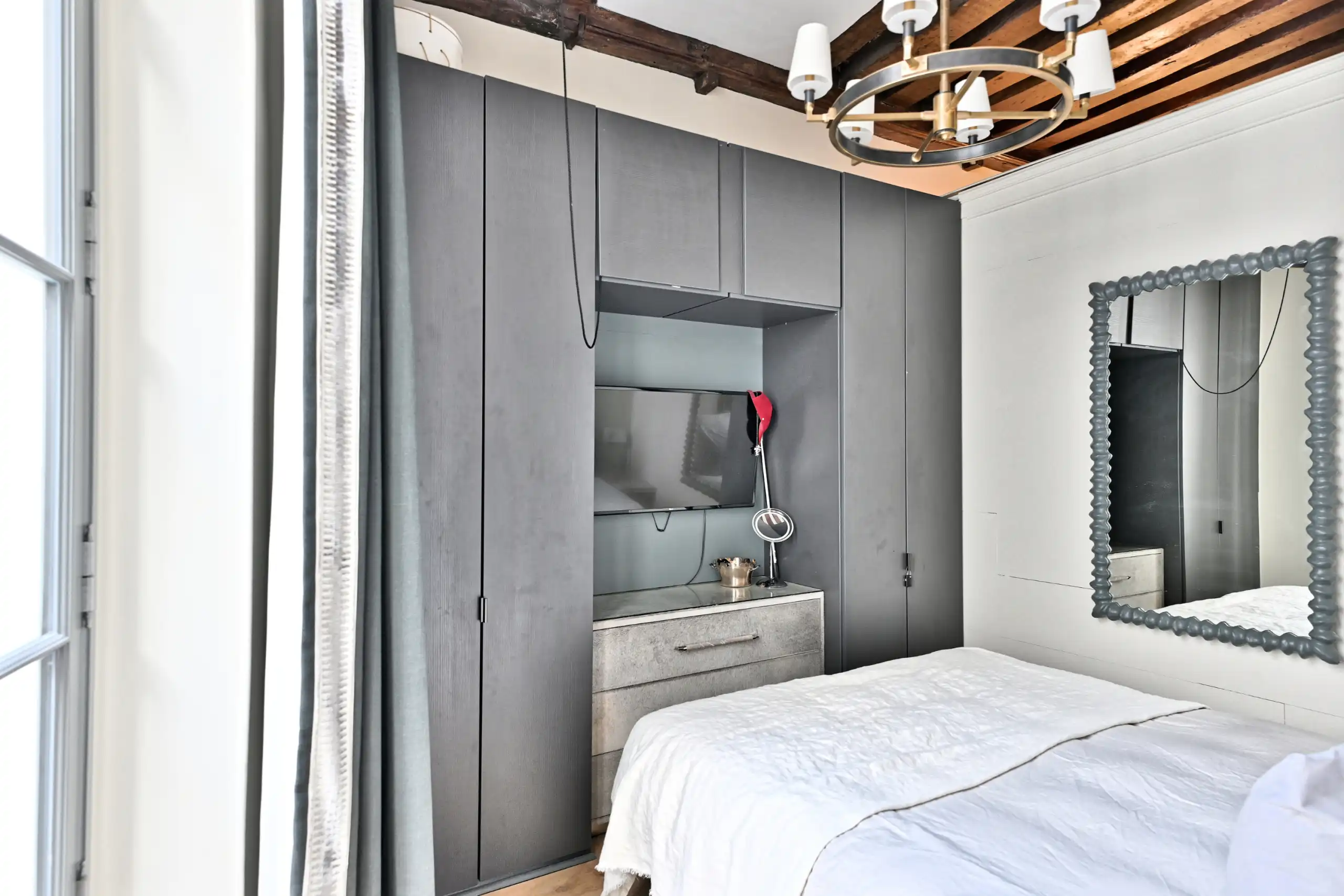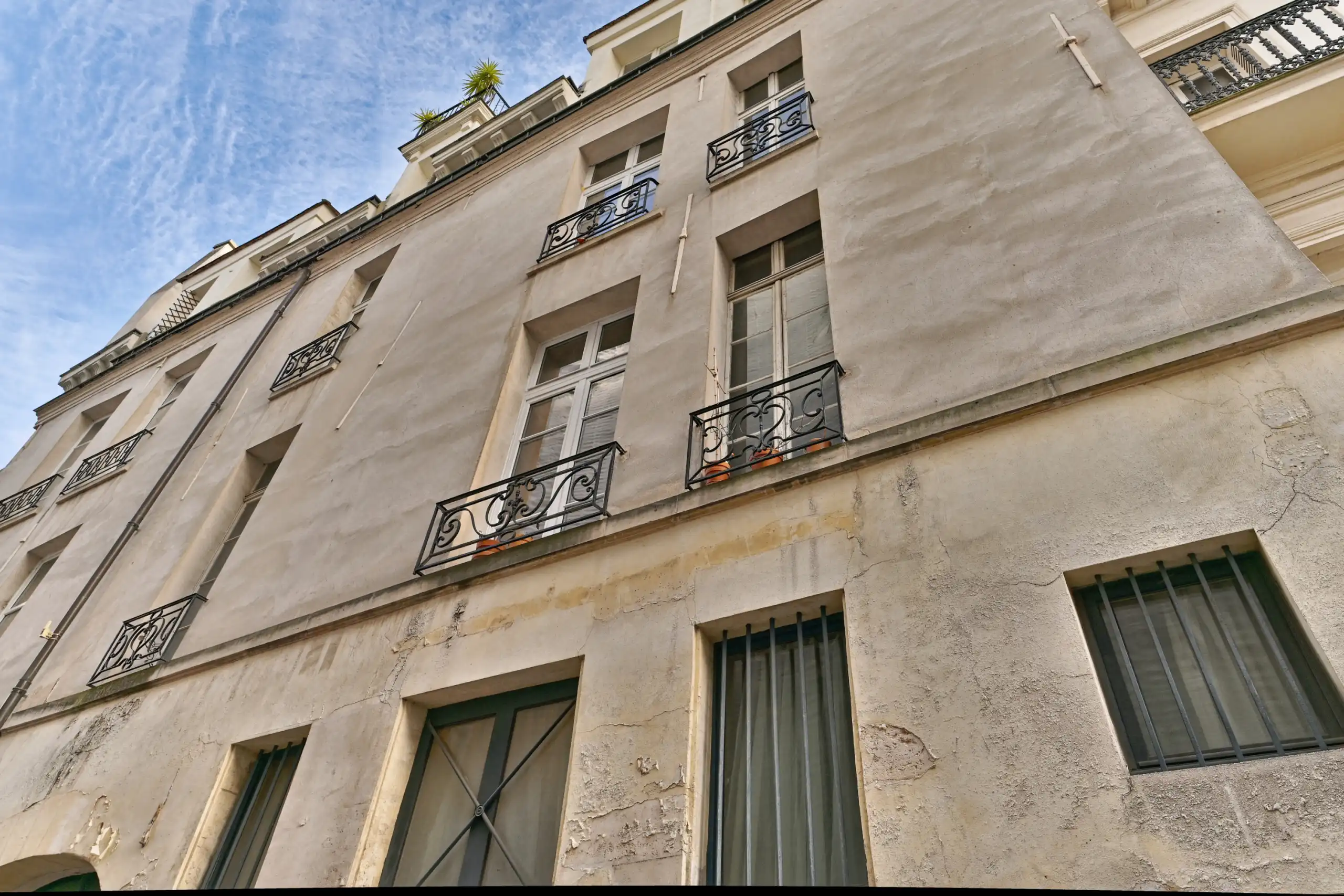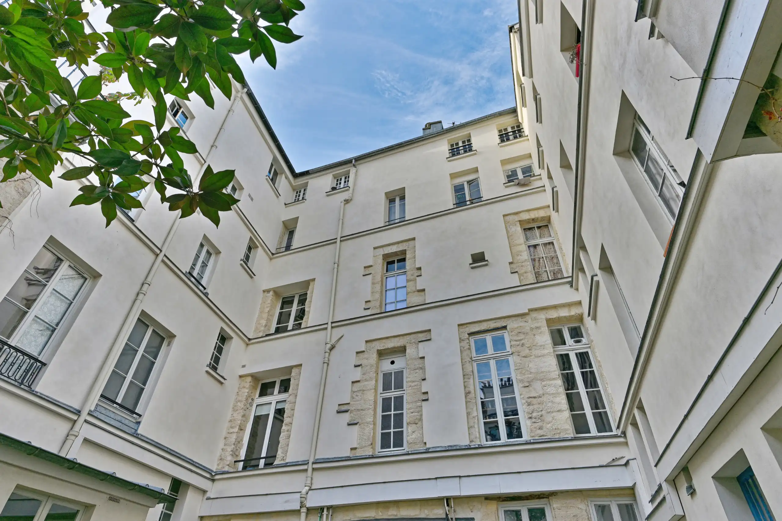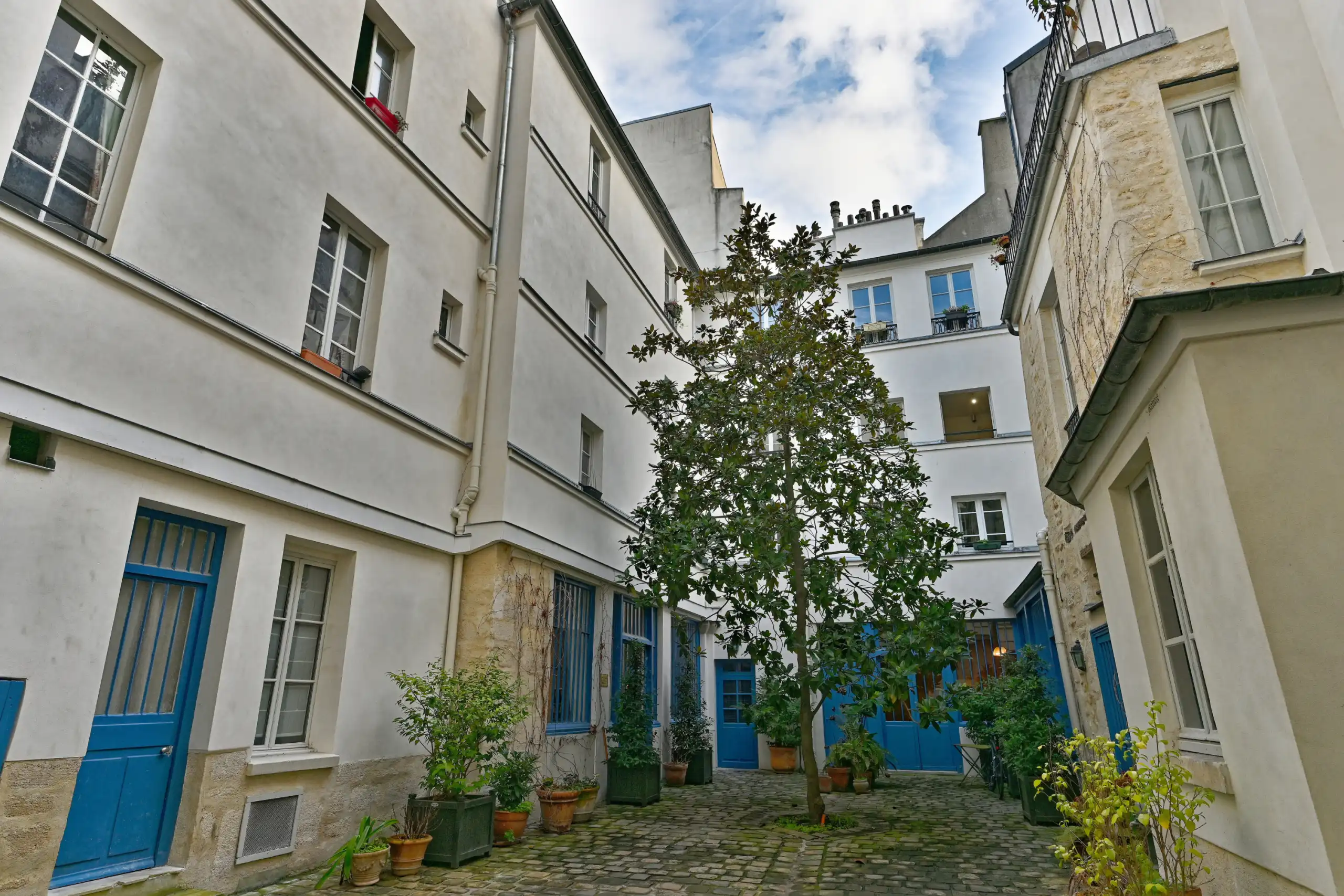The property was an artist’s atelier transformed into a 39m2 1 bedroom apartment well located in the Village St Paul district of the 4th ardt. Rue du Petit Musc is a historic street dating to the 16th century and has recently become a pedestrian street. This property is double facing street/courtyard on the 1st floor out of 4, accessible by a stairwell. The courtyard façade was just renovated and the planted courtyard is very