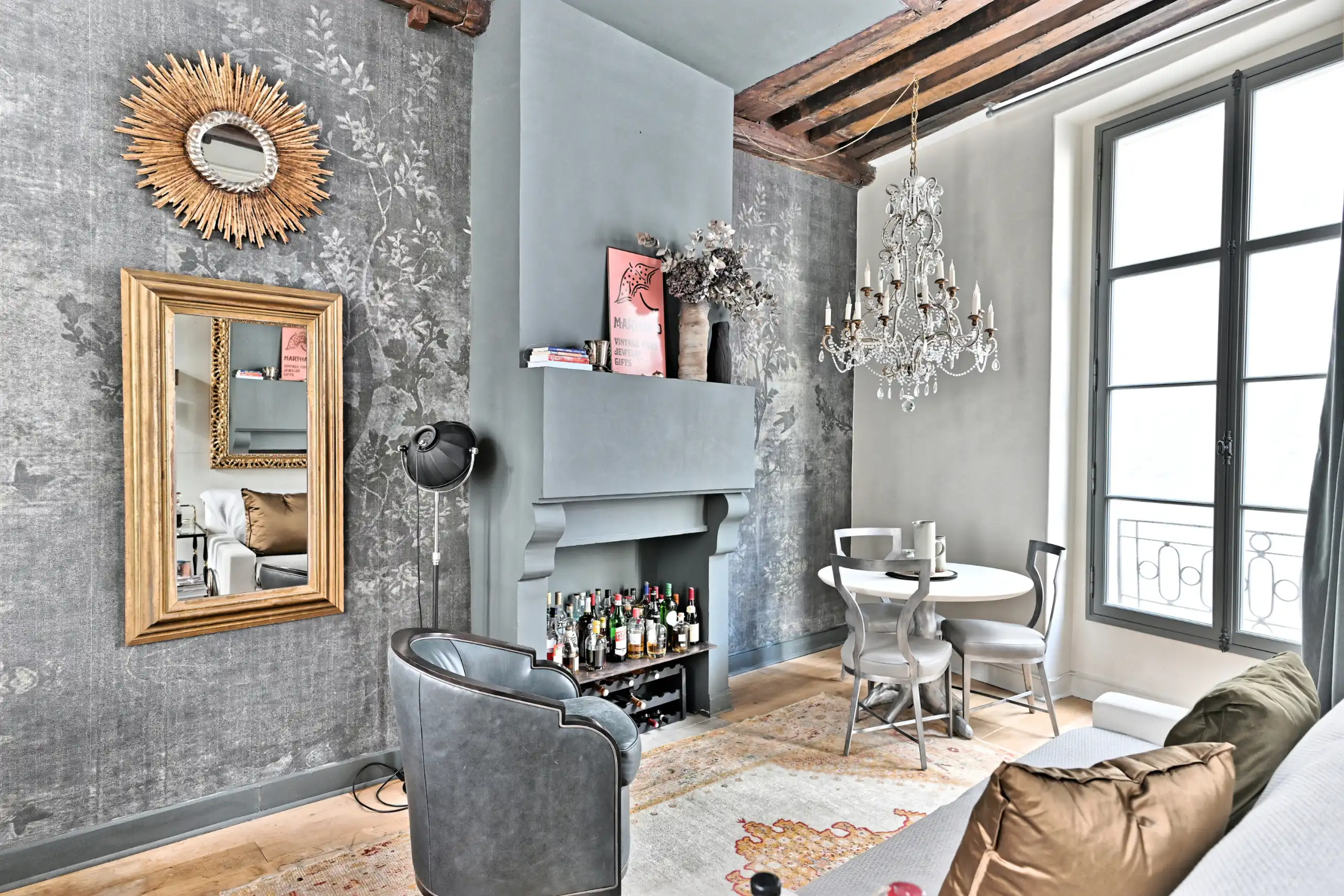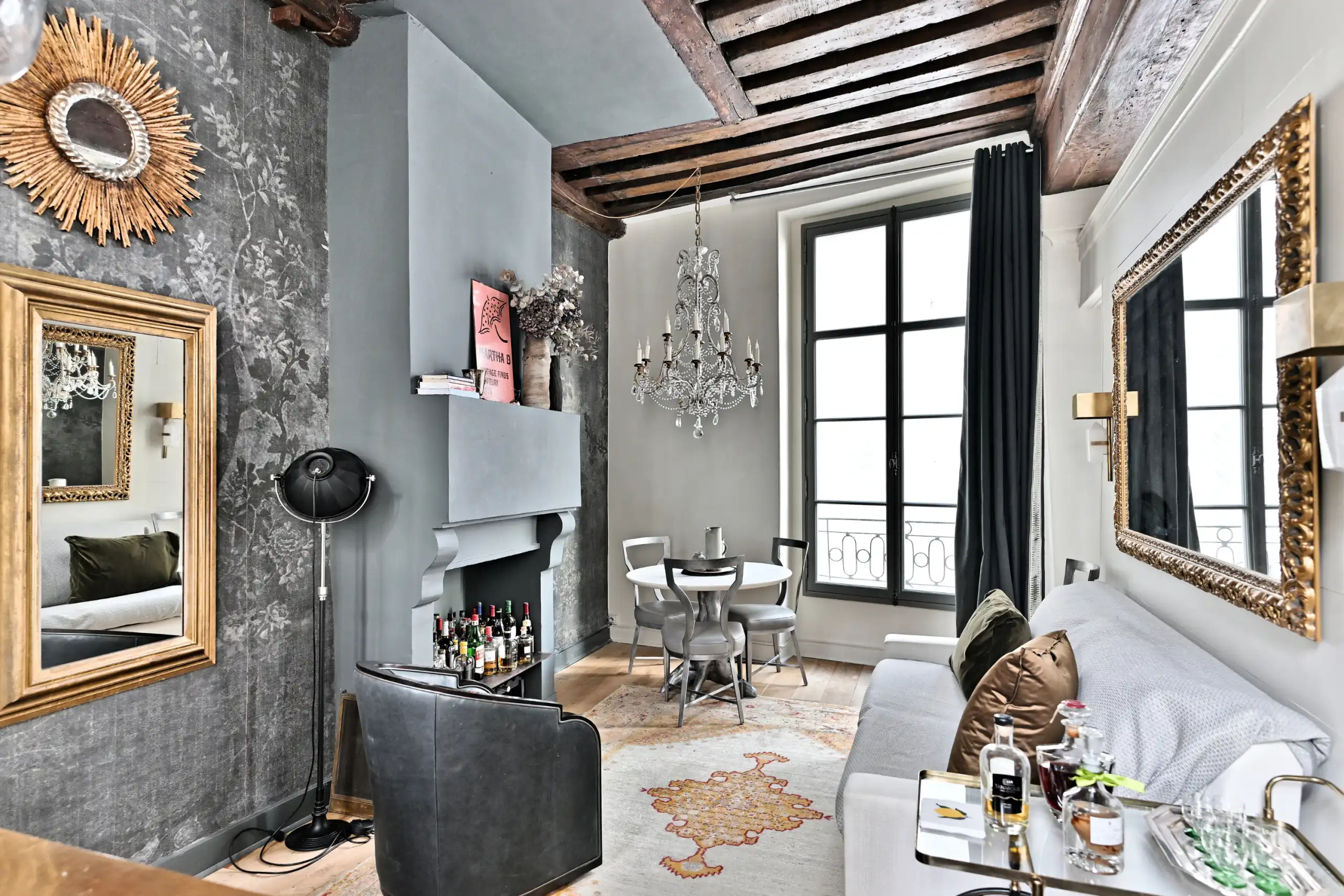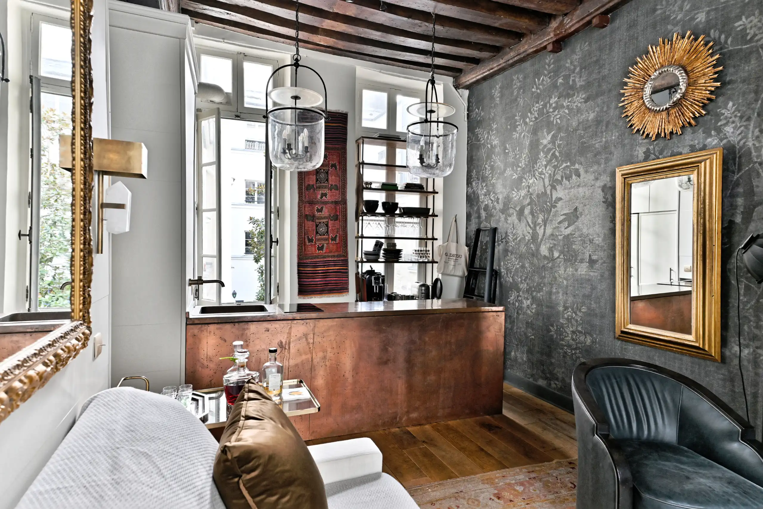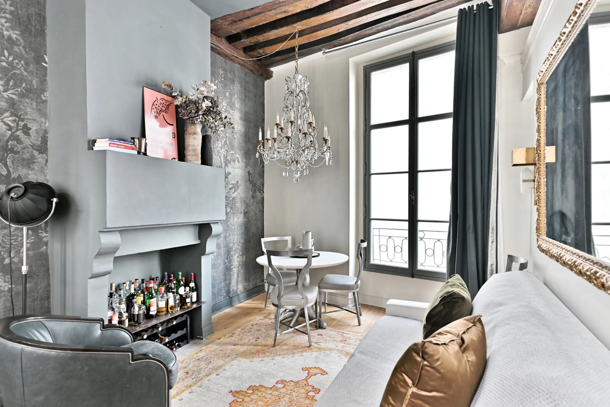 The property was an artist’s atelier transformed into a 39m2 1 bedroom apartment well located in the Village St Paul district of the 4th ardt. Rue du Petit Musc is a historic street dating to the 16th century and has recently become a pedestrian street. This property is double facing street/courtyard on the 1st floor out of 4, accessible by a stairwell. The courtyard façade was just renovated and the planted courtyard is very