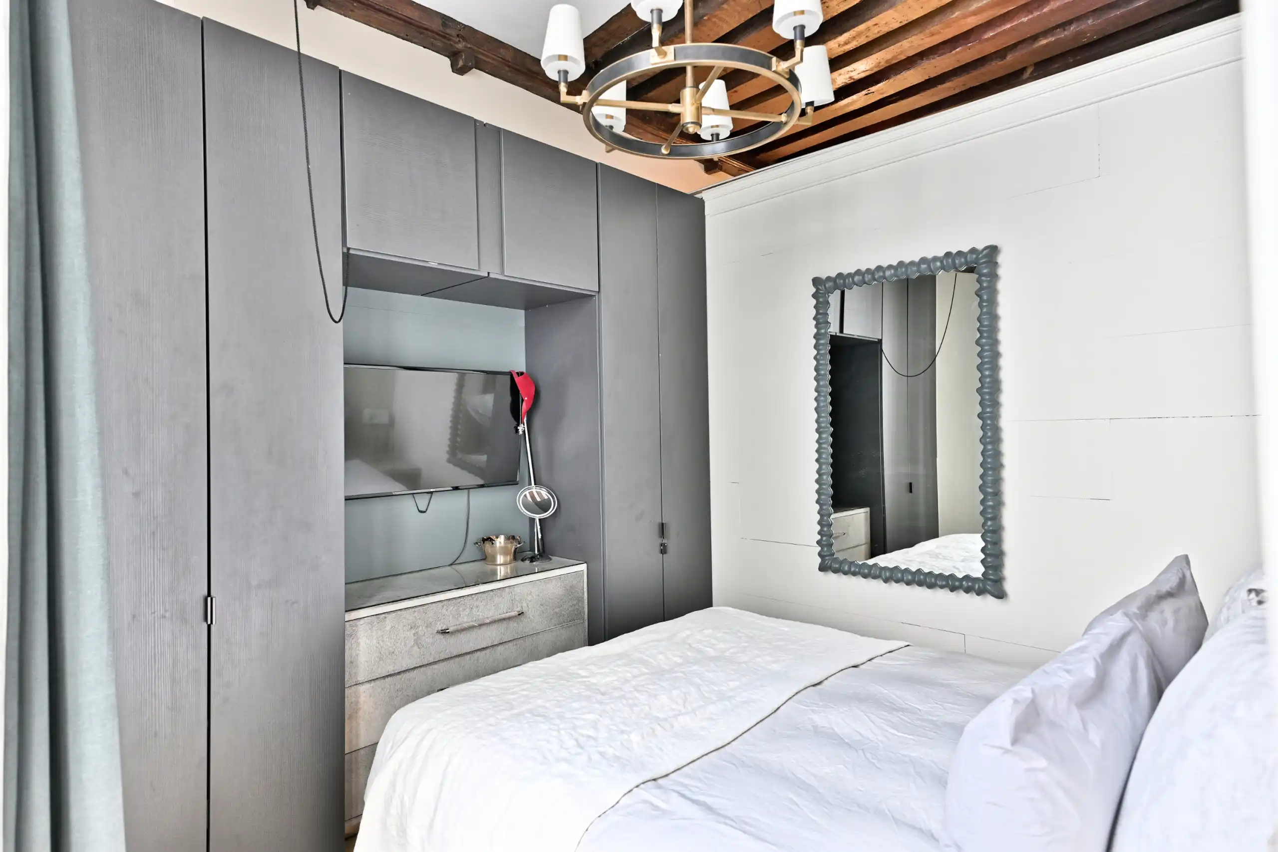 This property is very bright facing West on the street and East on the courtyard. It has 4 floor to ceiling windows and a ceiling height of 3M6. The entrance includes a utility closet with a combo washer and dryer and a shower room with a toilet. The main living area has a large Historic fireplace and a well equipped open kitchen. The street side windows are new double pane custom made windows. The large bedroom fits a king bed and has a wall of closets.
