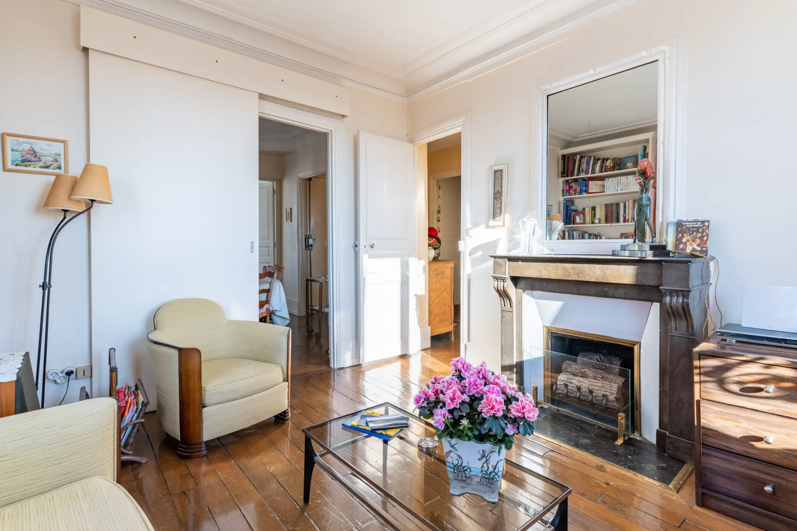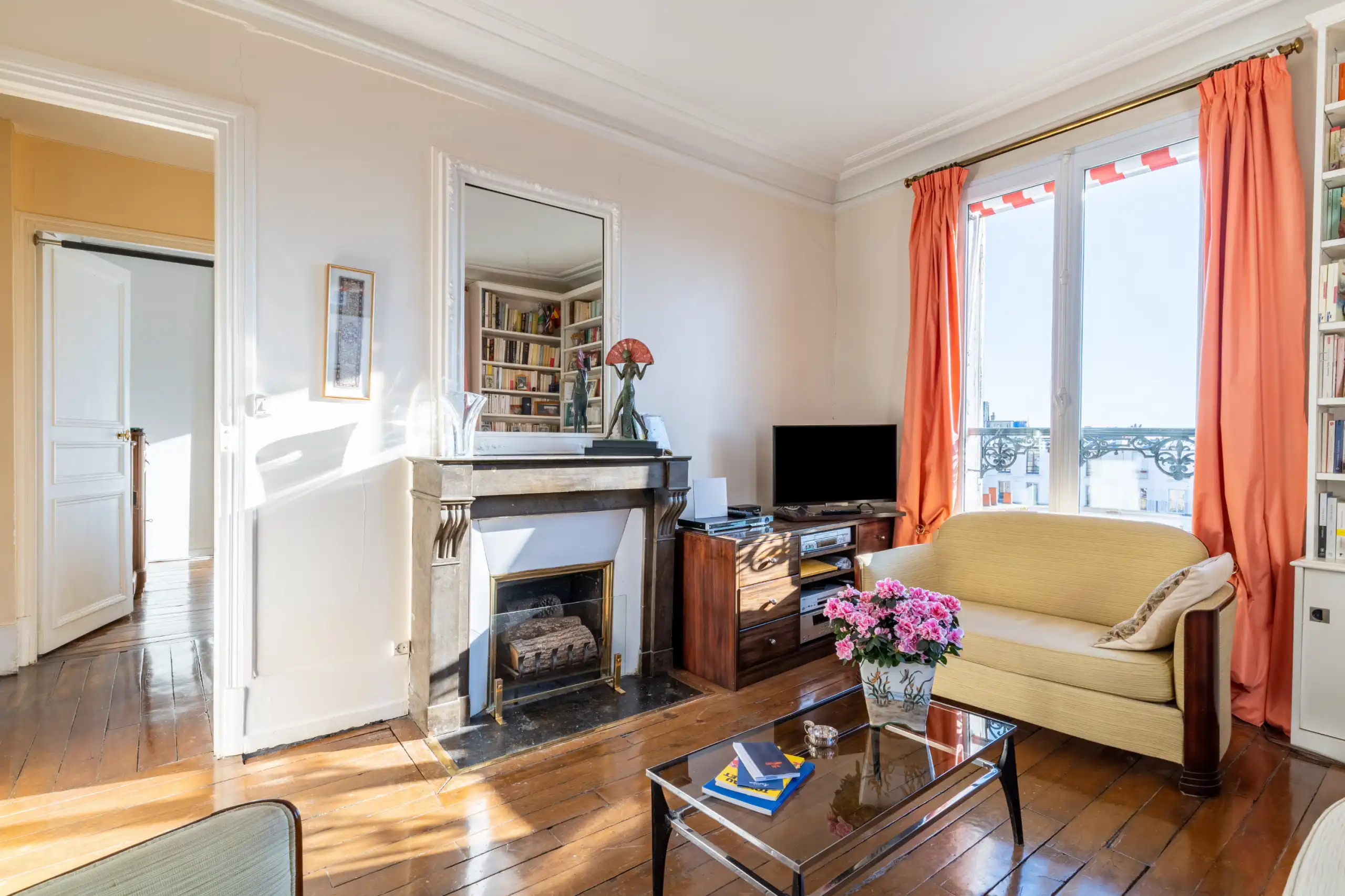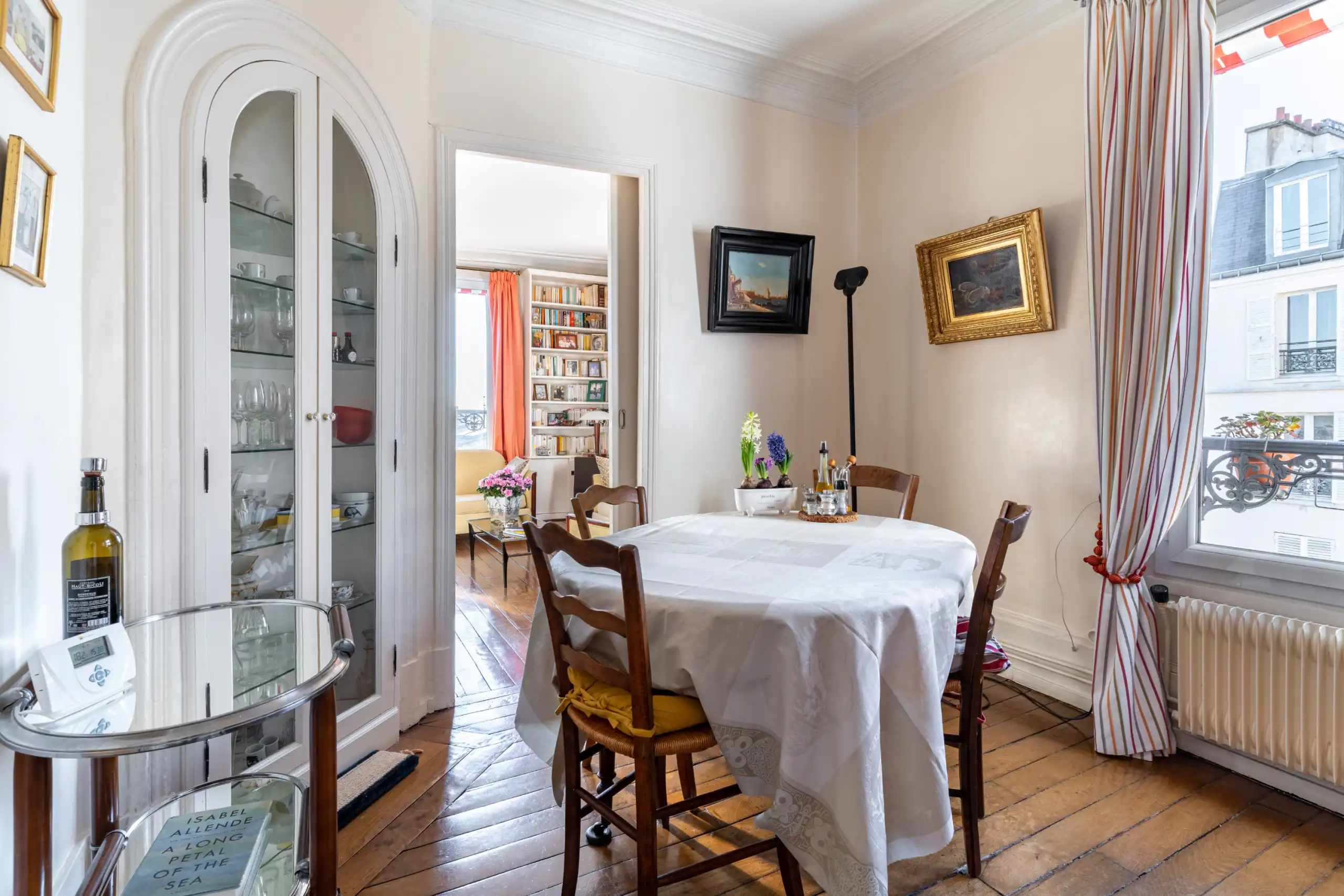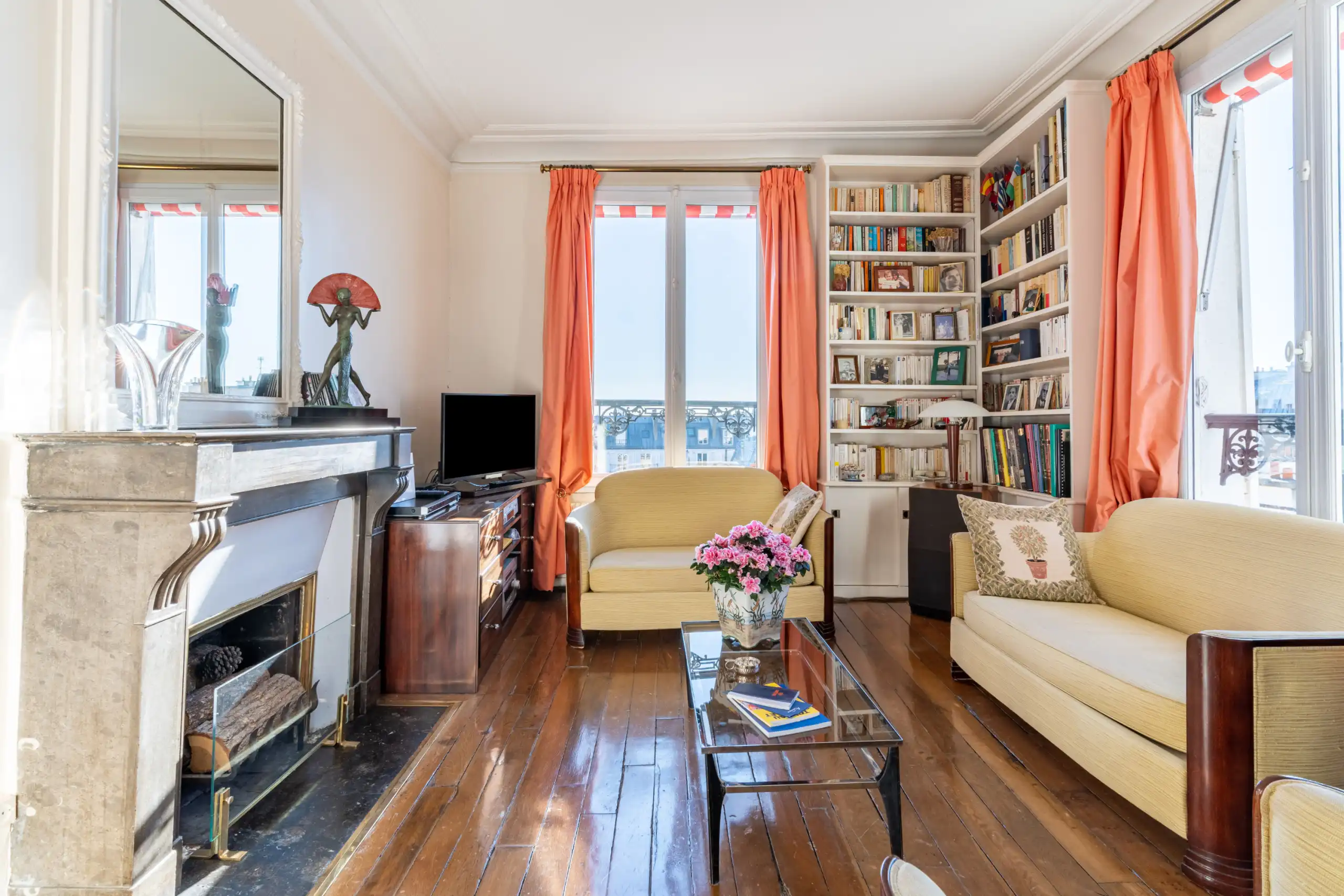 Two apartments were combined to form this 60m² apartment, creating a unified space with nine generous windows and views in all four directions and primarily facing South and South-West. The unobstructed views of the city including the Eiffel Tower are breathtaking. The apartment has all of its original period features, including a fireplace, original wood floors and crown moldings throughout the apartment.