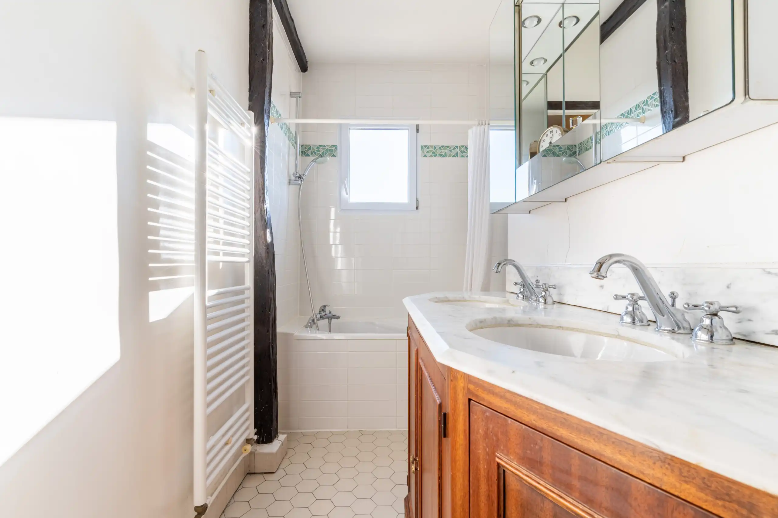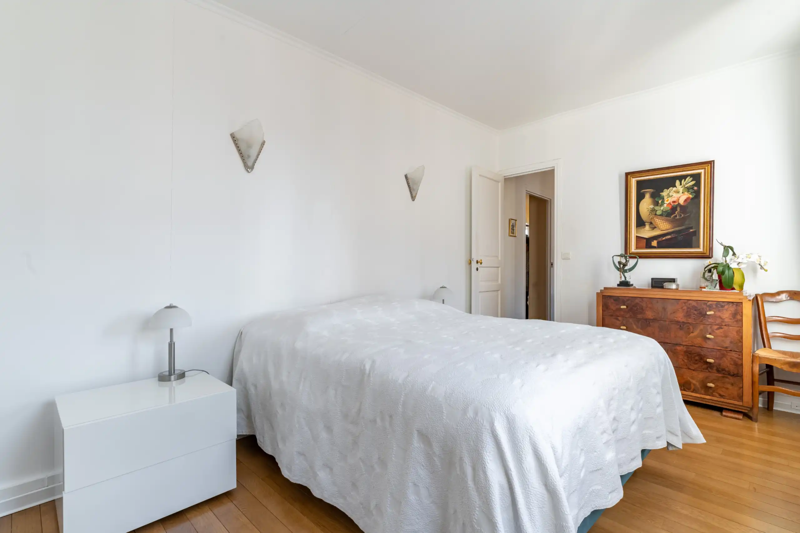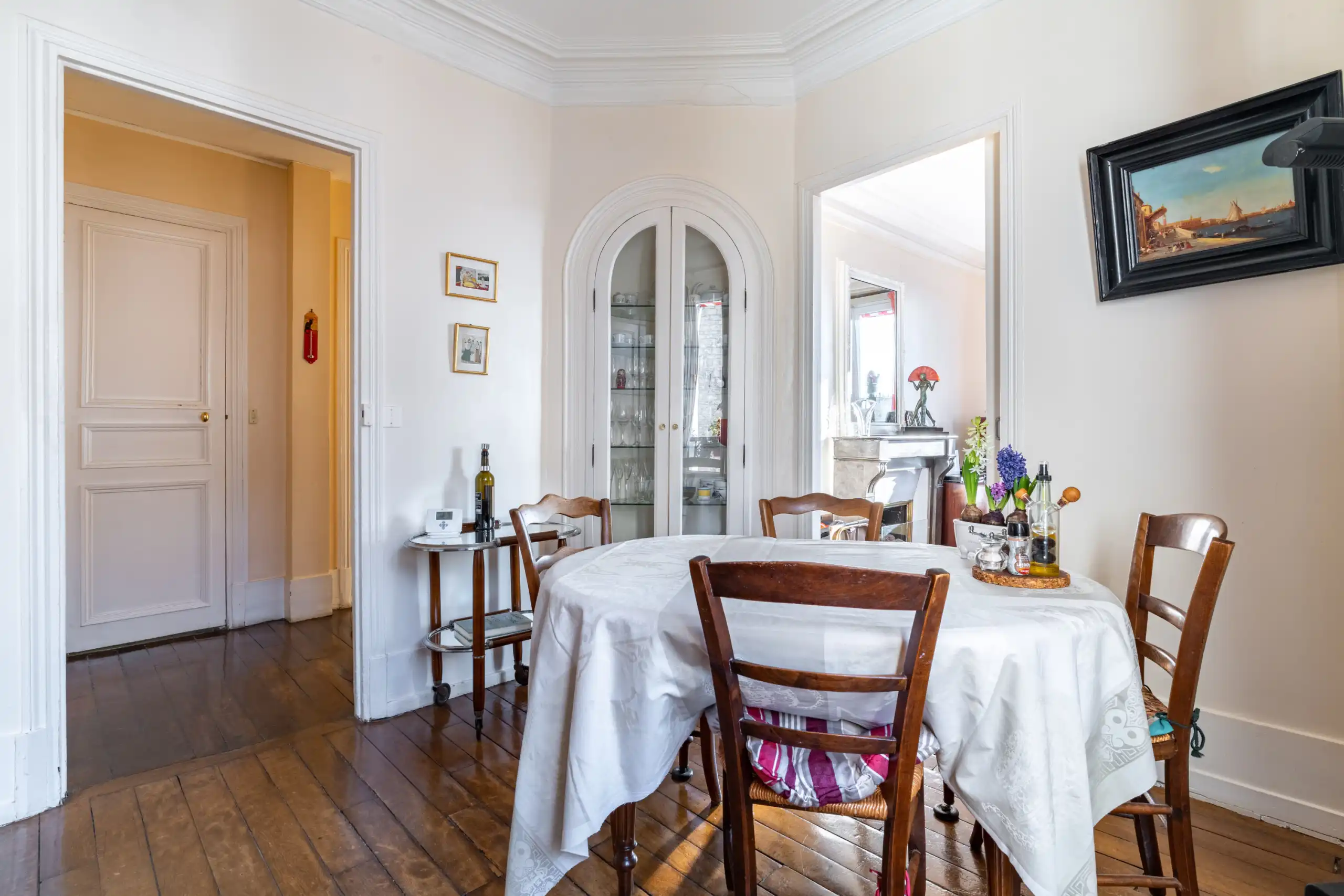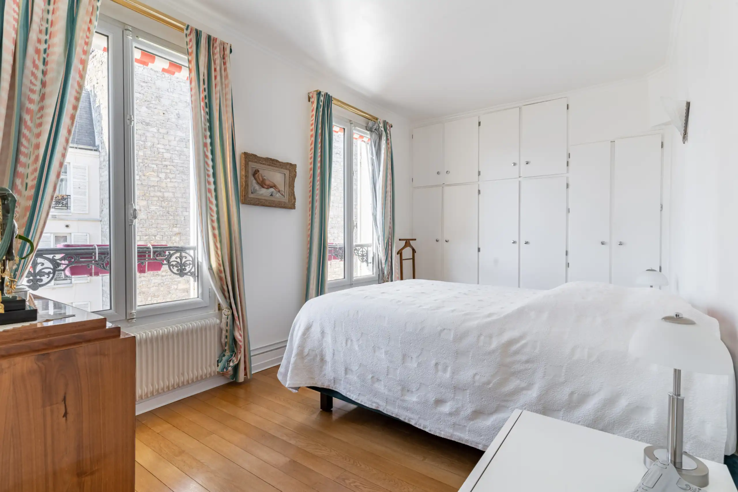 Two apartments were combined to form this 60m² apartment, creating a unified space with nine generous windows and views in all four directions and primarily facing South and South-West. The unobstructed views of the city including the Eiffel Tower are breathtaking. The apartment has all of its original period features, including a fireplace, original wood floors and crown moldings throughout the apartment.