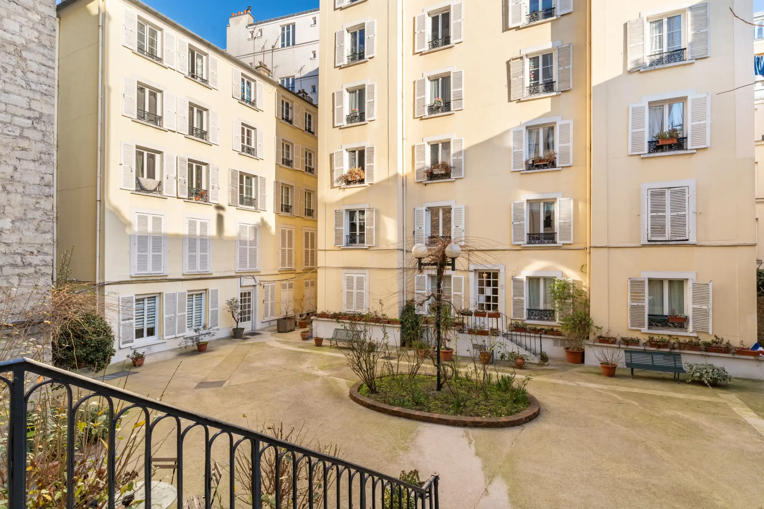 Located in the heart of charming Montmartre, this quiet apartment on the 5th floor with elevator and panoramic view of Paris is not to be missed. The beautiful 18th century building is in impeccable condition, set in a large courtyard with trees.
