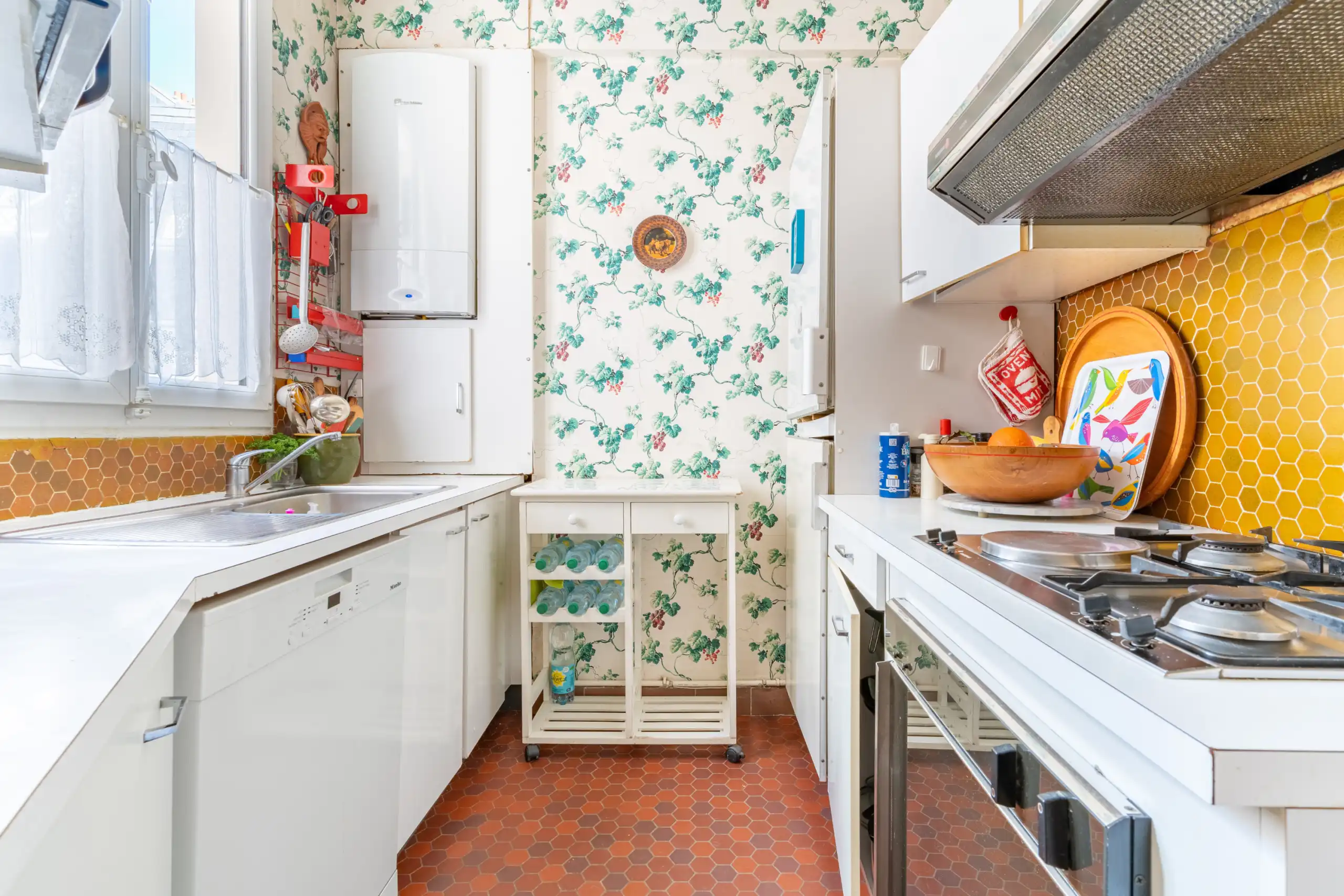 The property is in excellent condition, with double-glazed windows throughout, updated electricity, and gas heating. The building manager is on-site. Home owner fees including elevator and janitor included are approximately 220 €/month. The apartment includes a private cellar for storage.