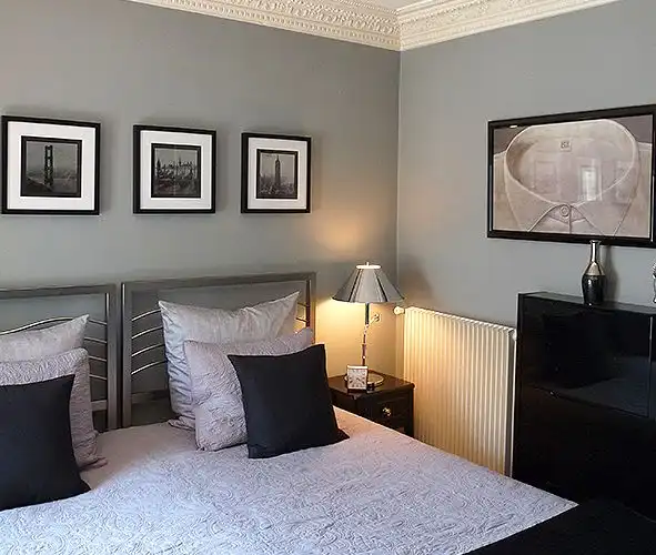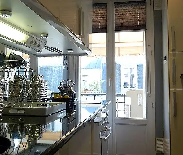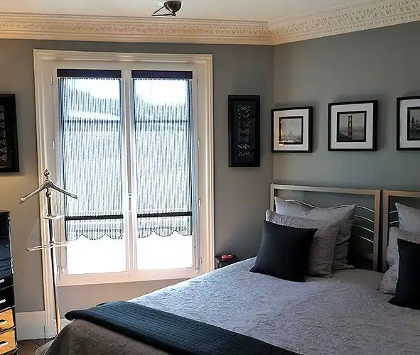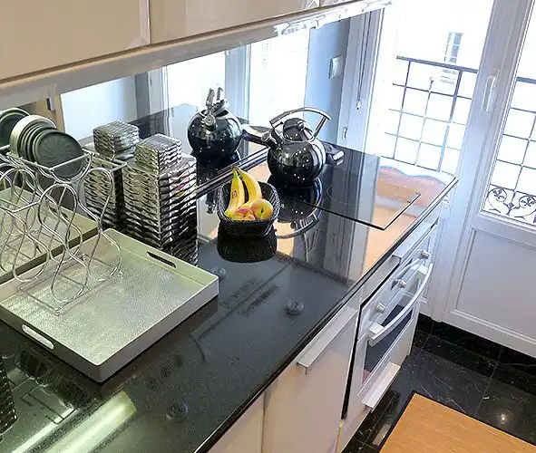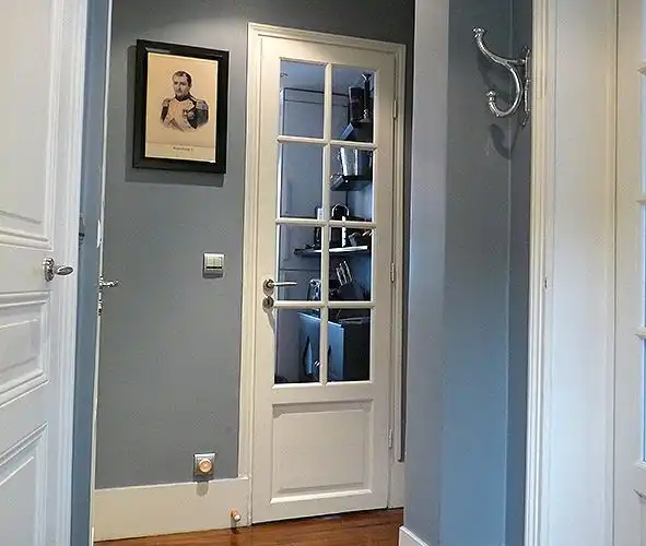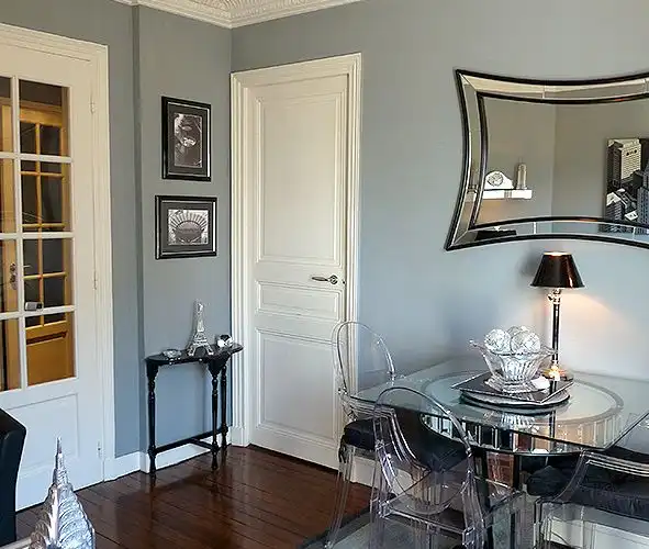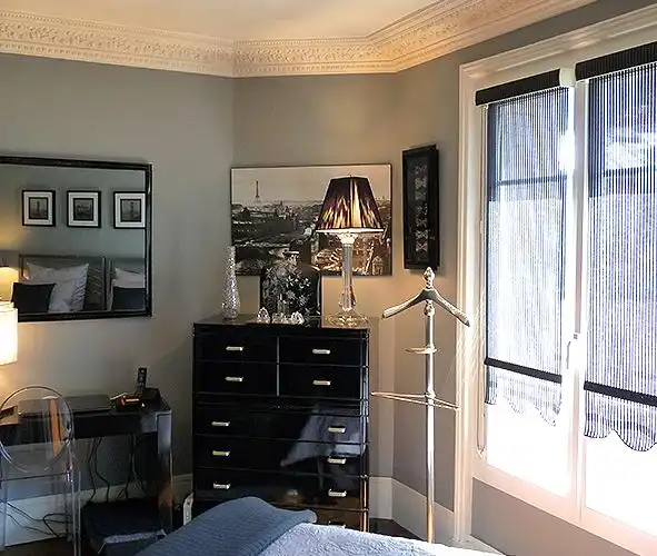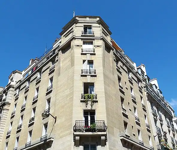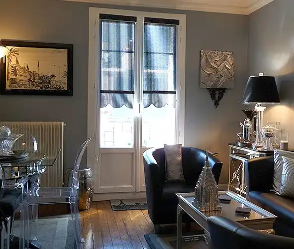 The top-floor property is on the 6th floor with elevator of a well maintained cut stone 1930s building.  It has been recently renovated with high quality materials. Decorated in an elegant blend of Art Deco and contemporary styles, it is sold fully furnished. The original parquet flooring and molding add to its charm.
