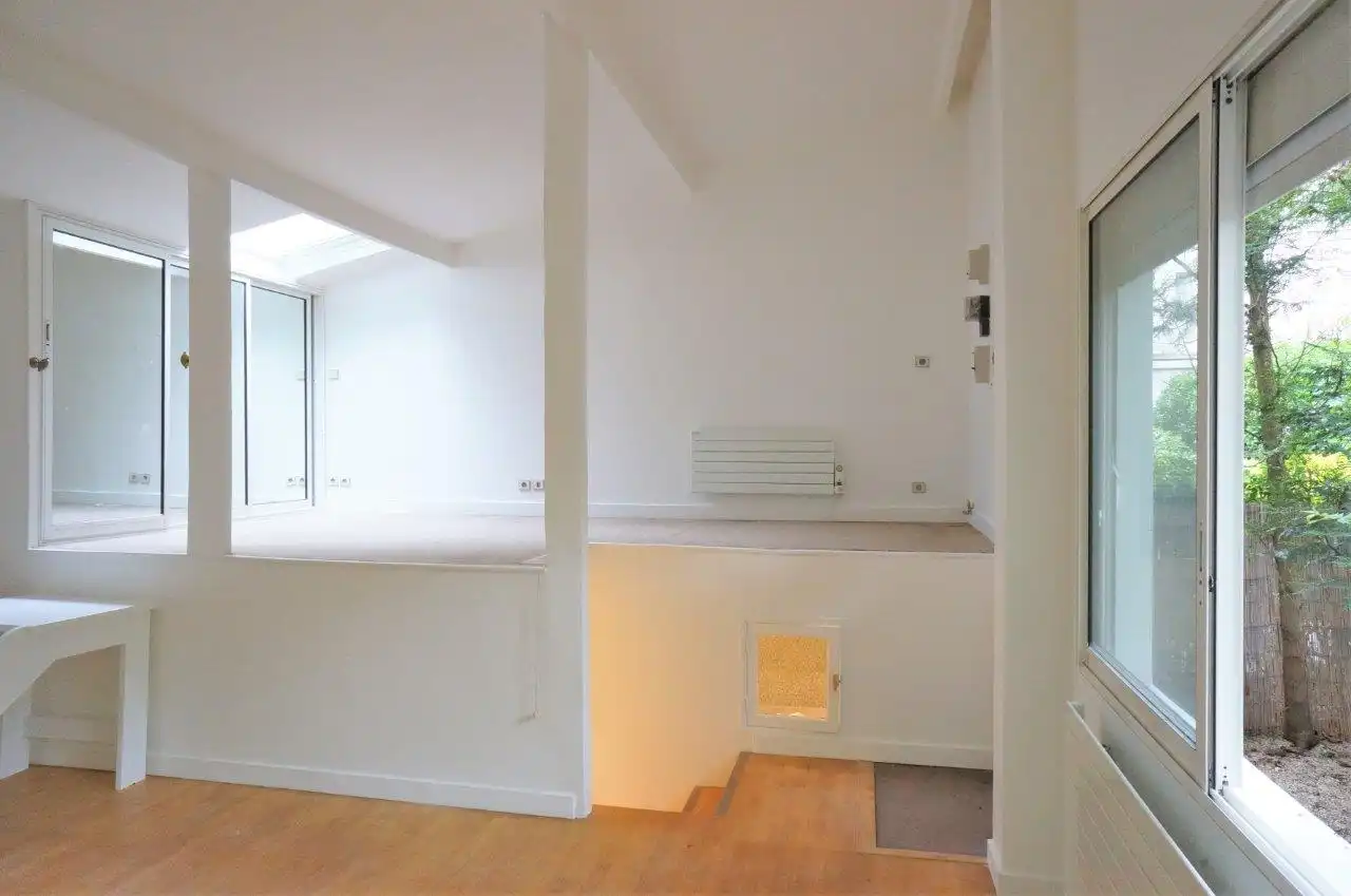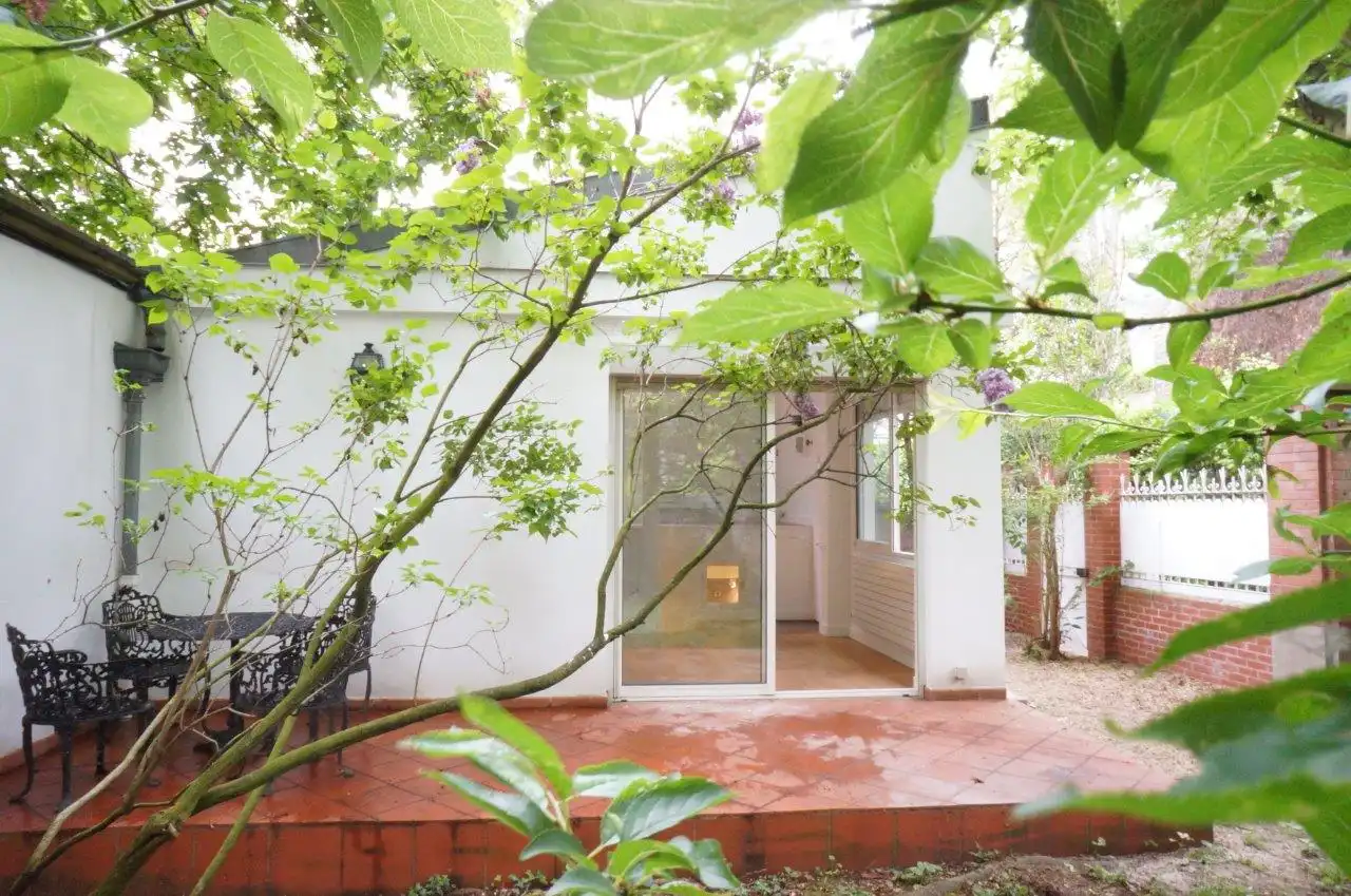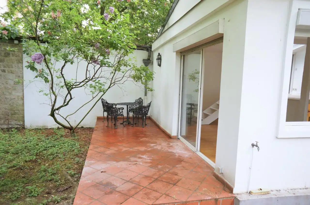 Abundant light enters from large windows and skylight.  The garden property offers privacy and nature close to the abundant shops, restaurants and public transport available in central Neuilly. The property is sequestered in a vast private garden space located between two brick and stone buildings, the private house is surrounded by a gated brick fence which marks the limit of the 96 m2 of garden that belongs exclusively to the property, ensuring that the sounds of birds and nature are all you hear even as you are conveniently located near all the conveniences of urban existence.