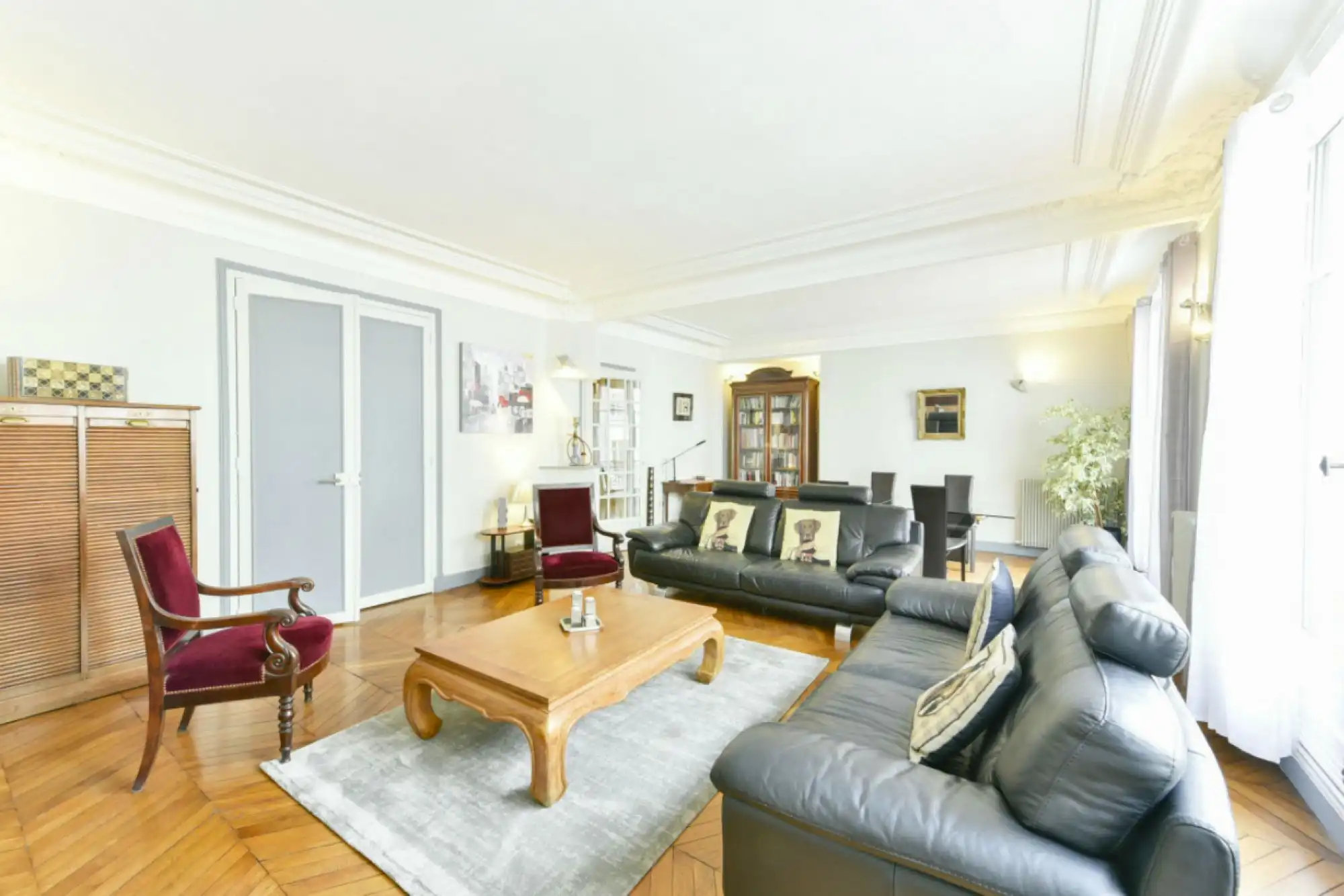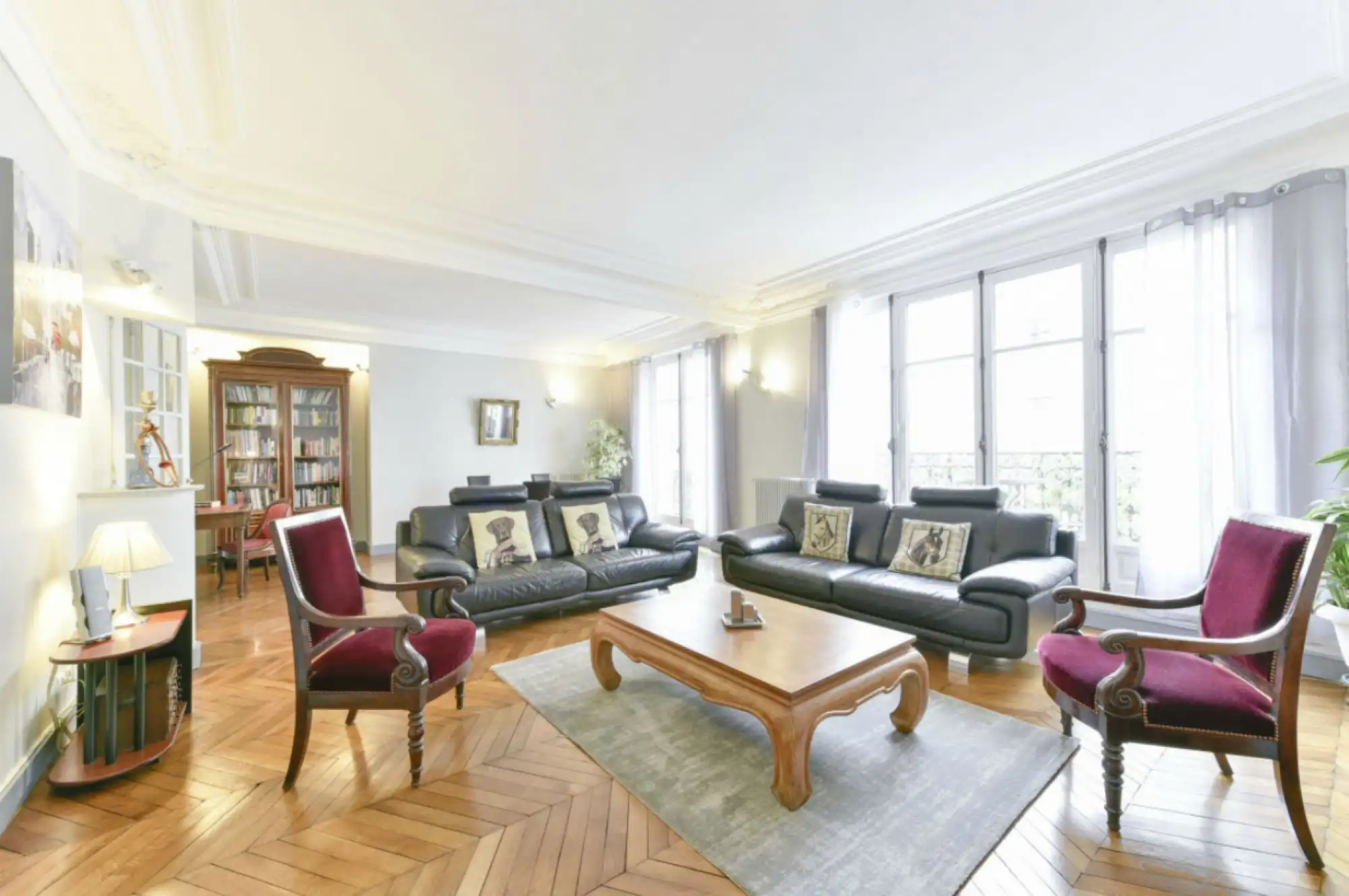 This 109 m2 apartment on rue Rambuteau in the prestigious Archives area of the Marais is on the 2nd floor of a well maintained pierre de taille stone building (no elevator). A beautiful entry opens to a large double living room that gives onto a long balcony via two large French doors. Two bedrooms over look a quiet inner courtyard. Large kitchen and bath.  Features original moldings and herringbone parquet flooring.  A storage cellar is also included.  FAI 4%