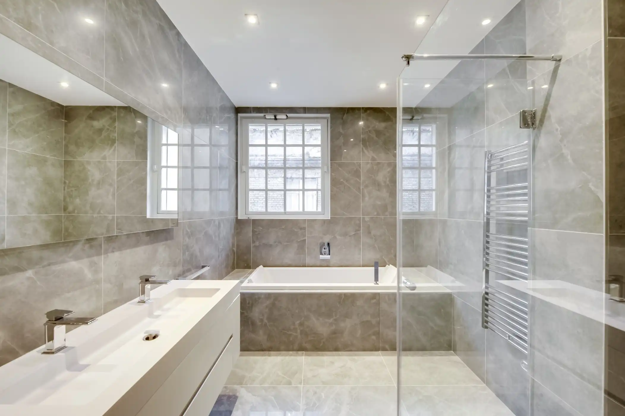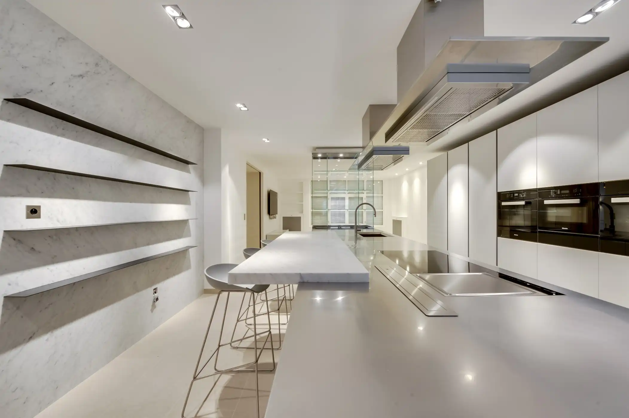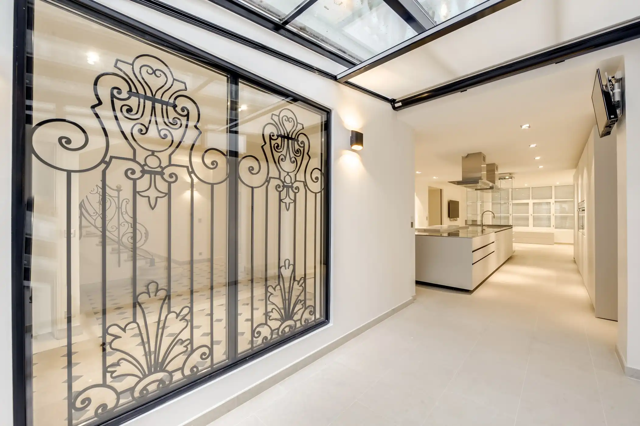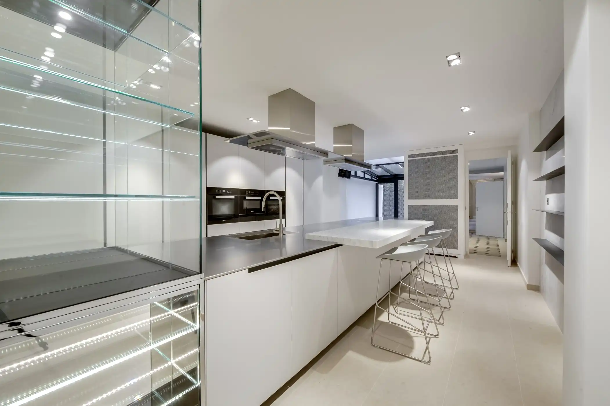 On the ground floor level, the property features a 33.47 m2 garden, an entrance gallery, a family room with TV/ media area and guest bath.  A gourmet kitchen fully equipped with high-end appliances and buffet island. A dining area with a glass ceiling opens onto two terraces of 12.8m2 and 22.35 m2 for true indoor / outdoor living in any season.