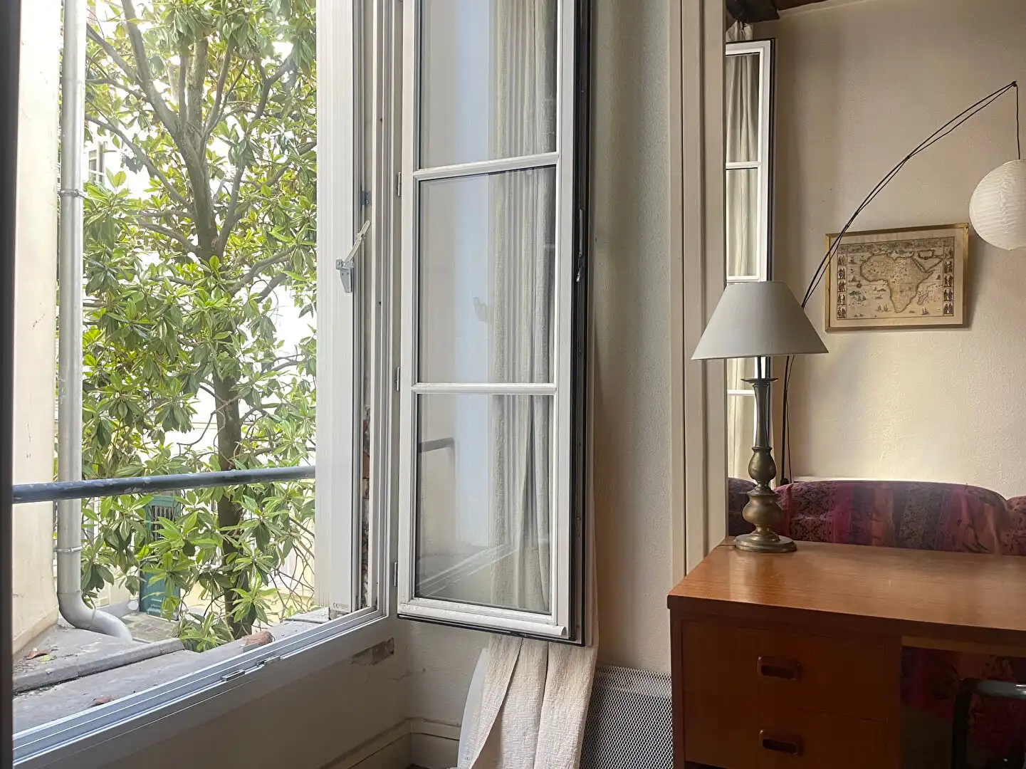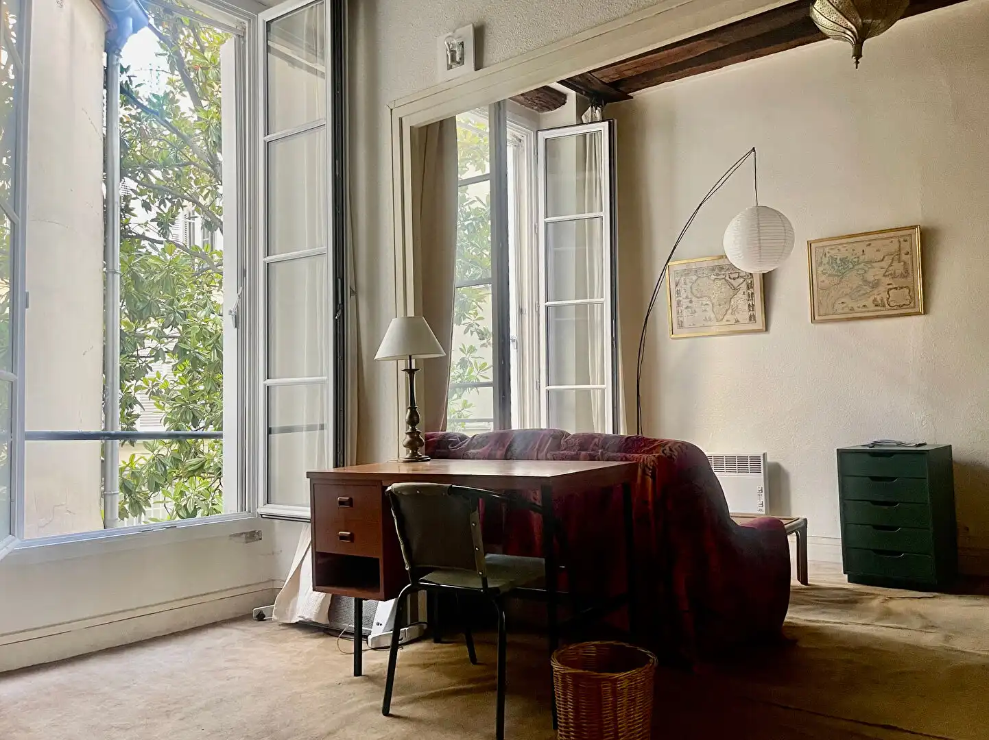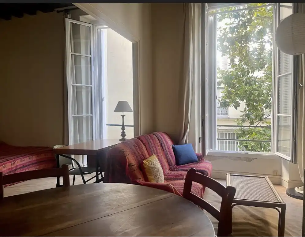Located on the first floor (second floor American) of a typical Marais building, this large 38 m2 studio apartment overlooks a leafy courtyard.  It is comprised of an entrance hall, a living room,with open plan kitchen, and a bathroom.  There is an option of partitioning the living room to create a separate bedroom.  A cellar completes this property.  The Marais location is close to amenities and in the central, most historic part of Paris.